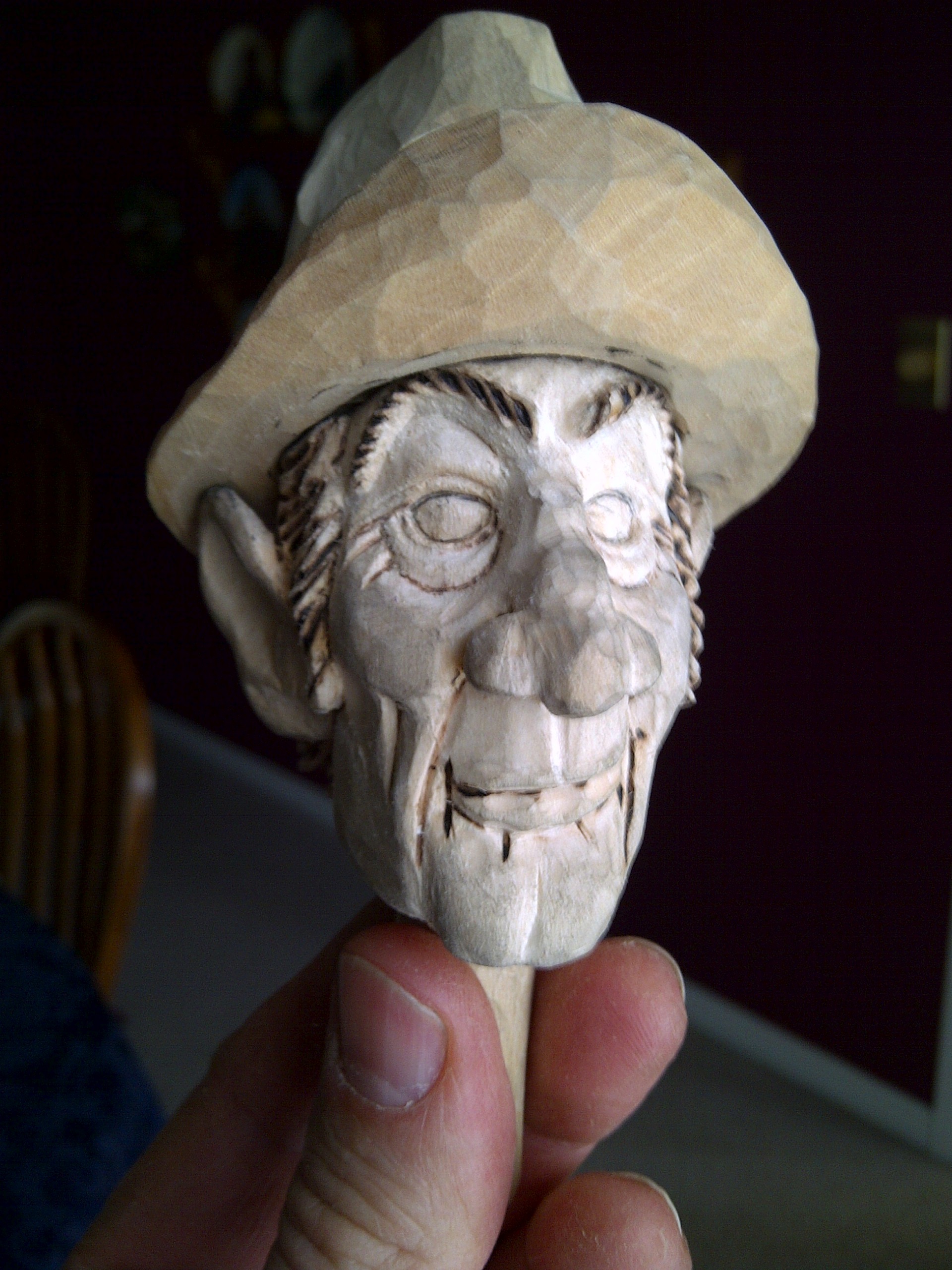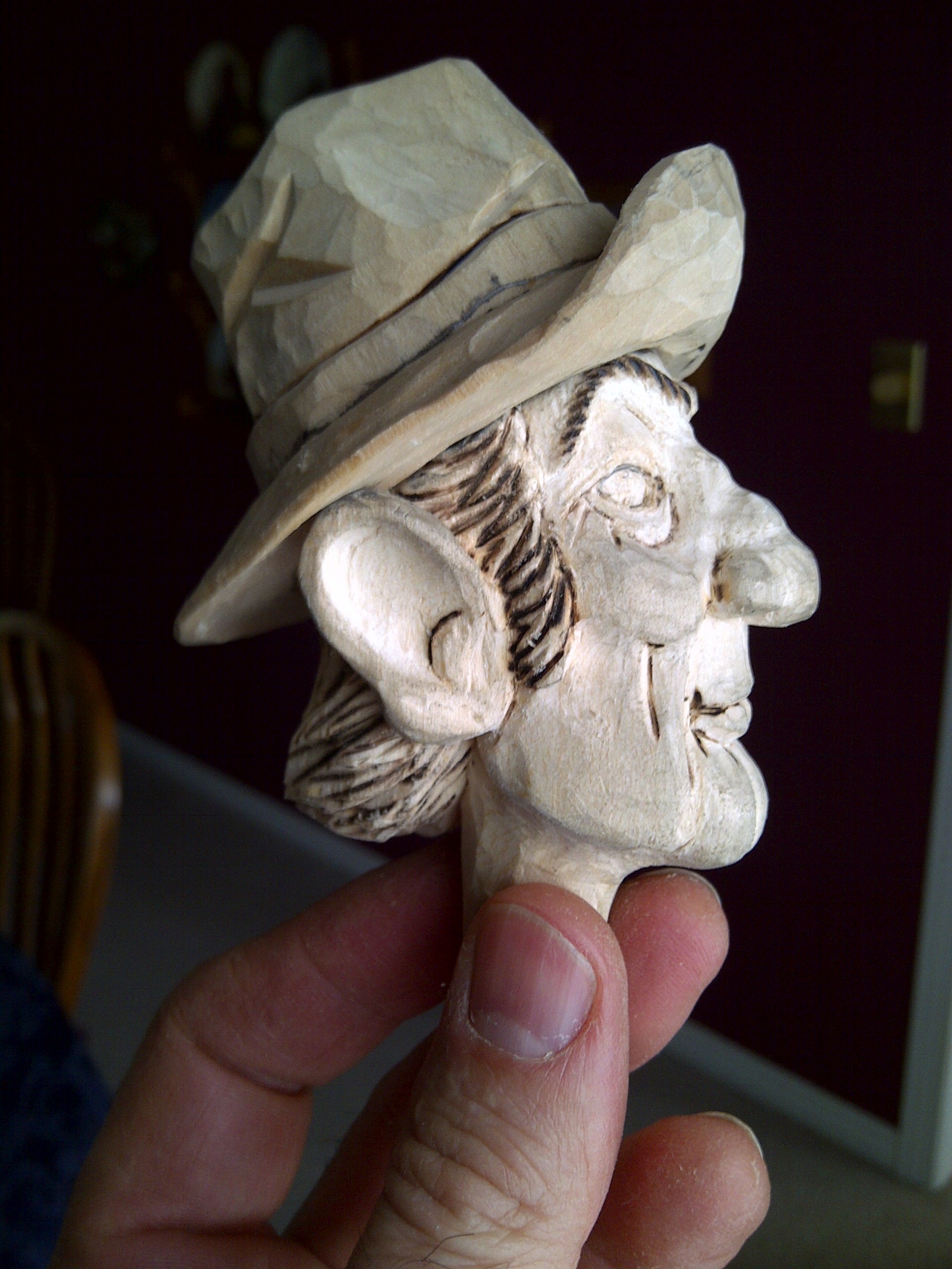 Yup, my little hobo has been named Ned. You’ll see that I’ve detailed a bit more since the last post. In particular, you might notice that I went with a different hat brim. I felt that the hat brim that was upturned by the wind at the back of the head ended up looking too “starched” for a good hobo hat. So, I carved up a new brim that is lower at the back and sides but still, I think, gives the impression that a good stiff wind is acting on it. Remember, my idea is to put him on a rail line rocketing along on a pump car.