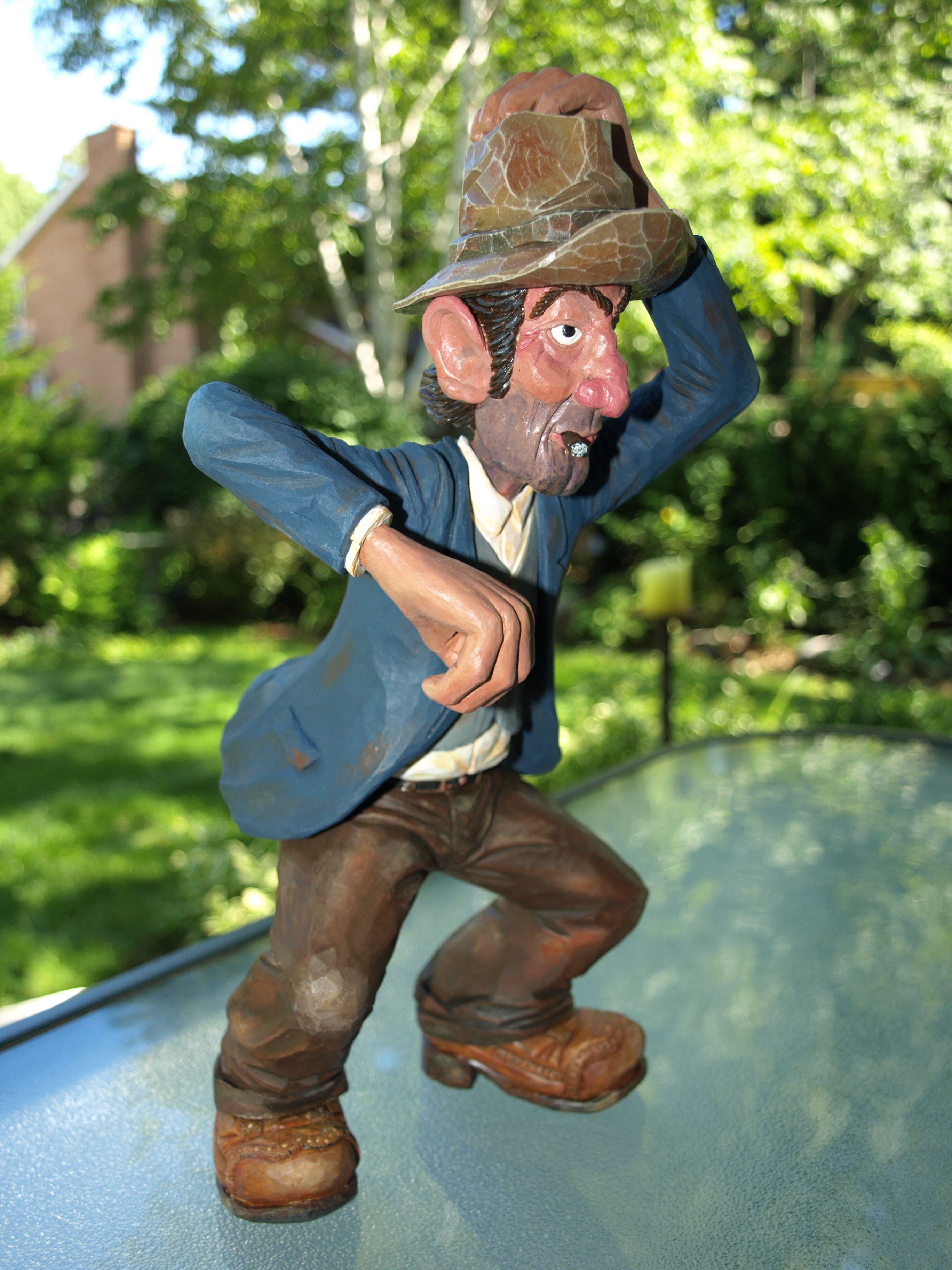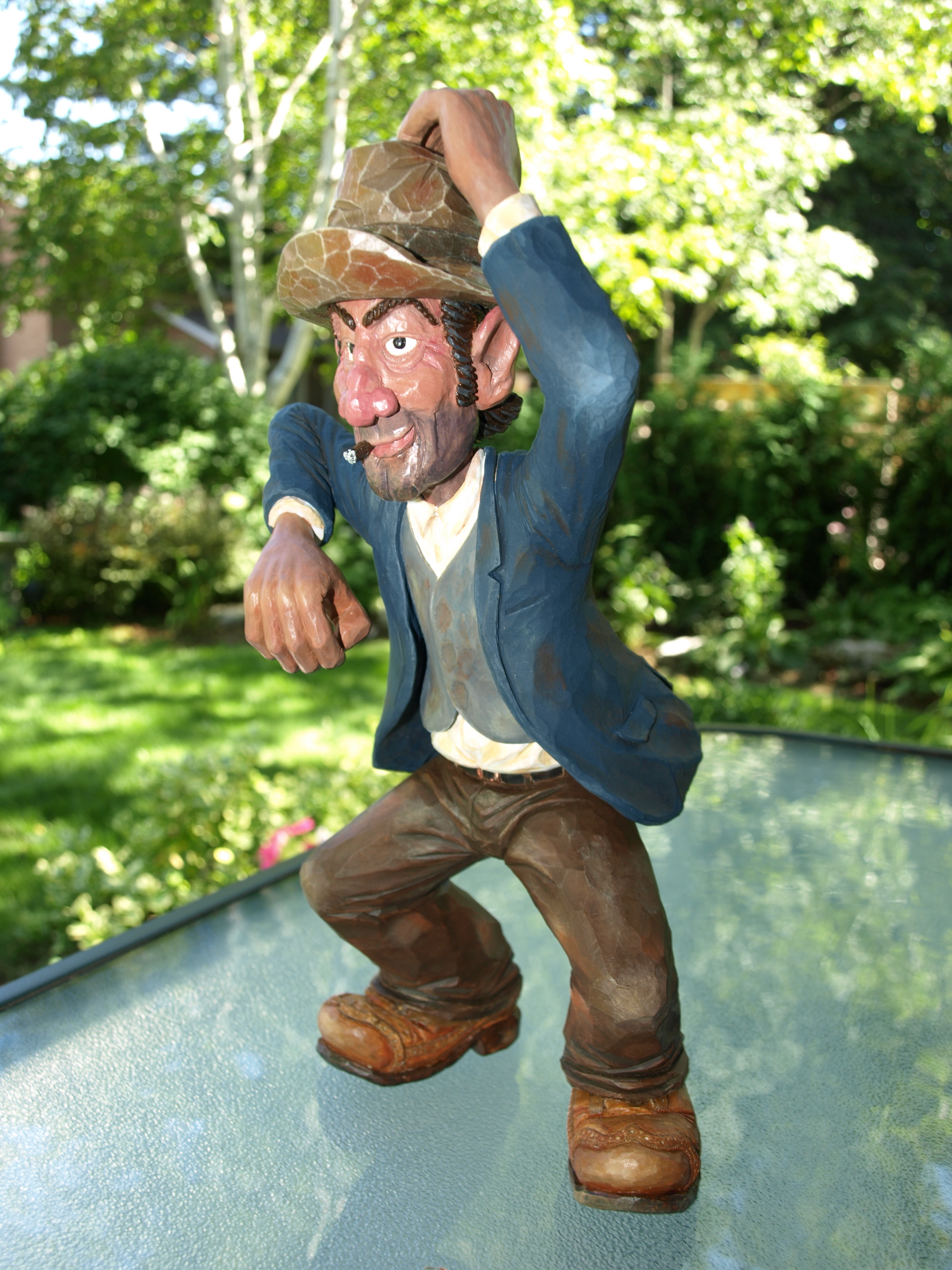 Here are a few shots of Ned with some paint.  I still have some highlighting to do as well as the clear urethane finish to protect ( and brighten ) the acrylics.  I’m pretty happy with the way that he’s turning out.  Peggy really likes the shoes as I have a similarly scuffed up pair downstairs.