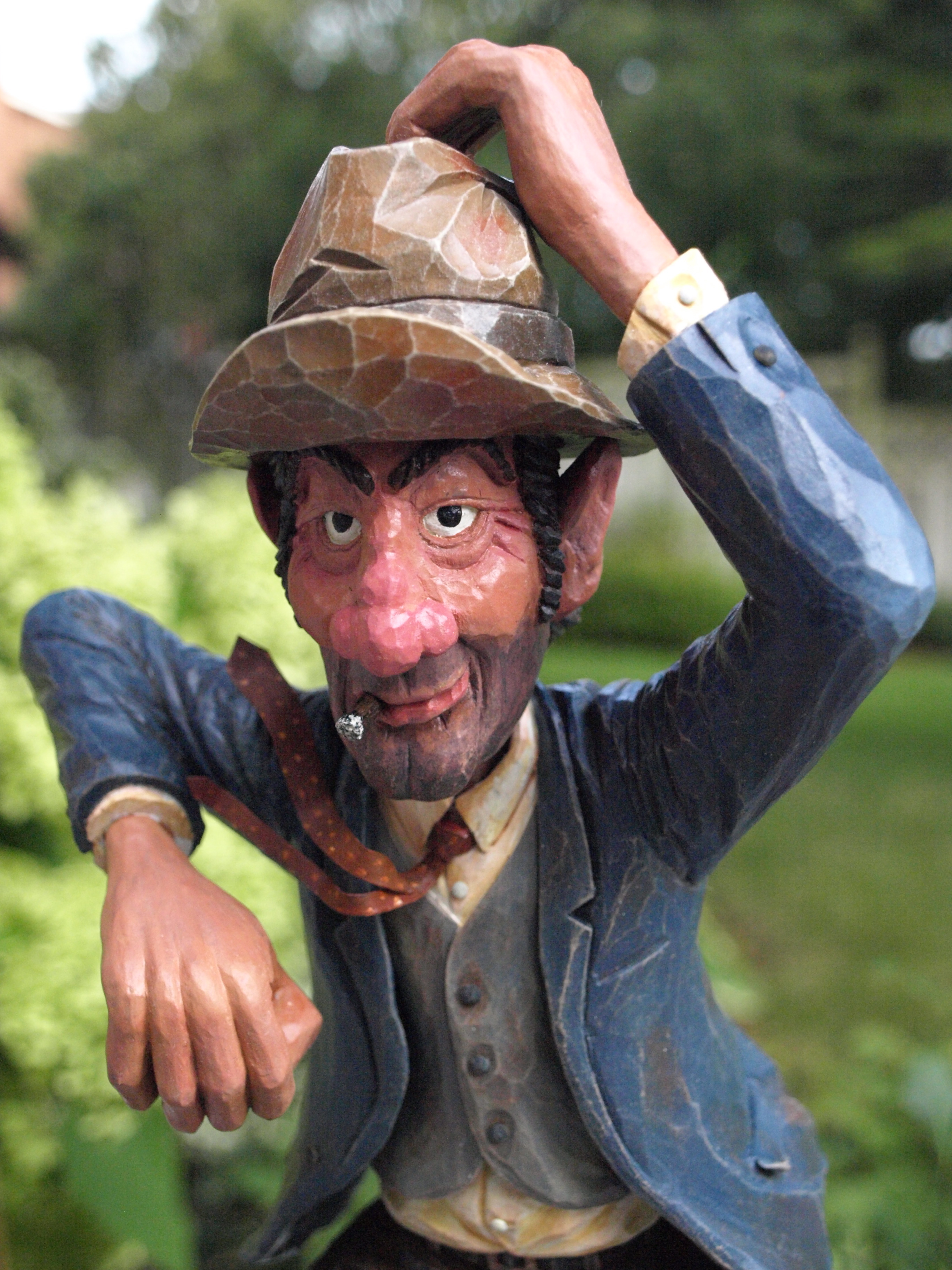 The buttons are nail heads, and on the shirt, pin heads. The tie is metal house flashing that I cut with a pair of heavy scissors and bent around to form a “windsor knot” and give the impression that the tie is flapping in the wind.