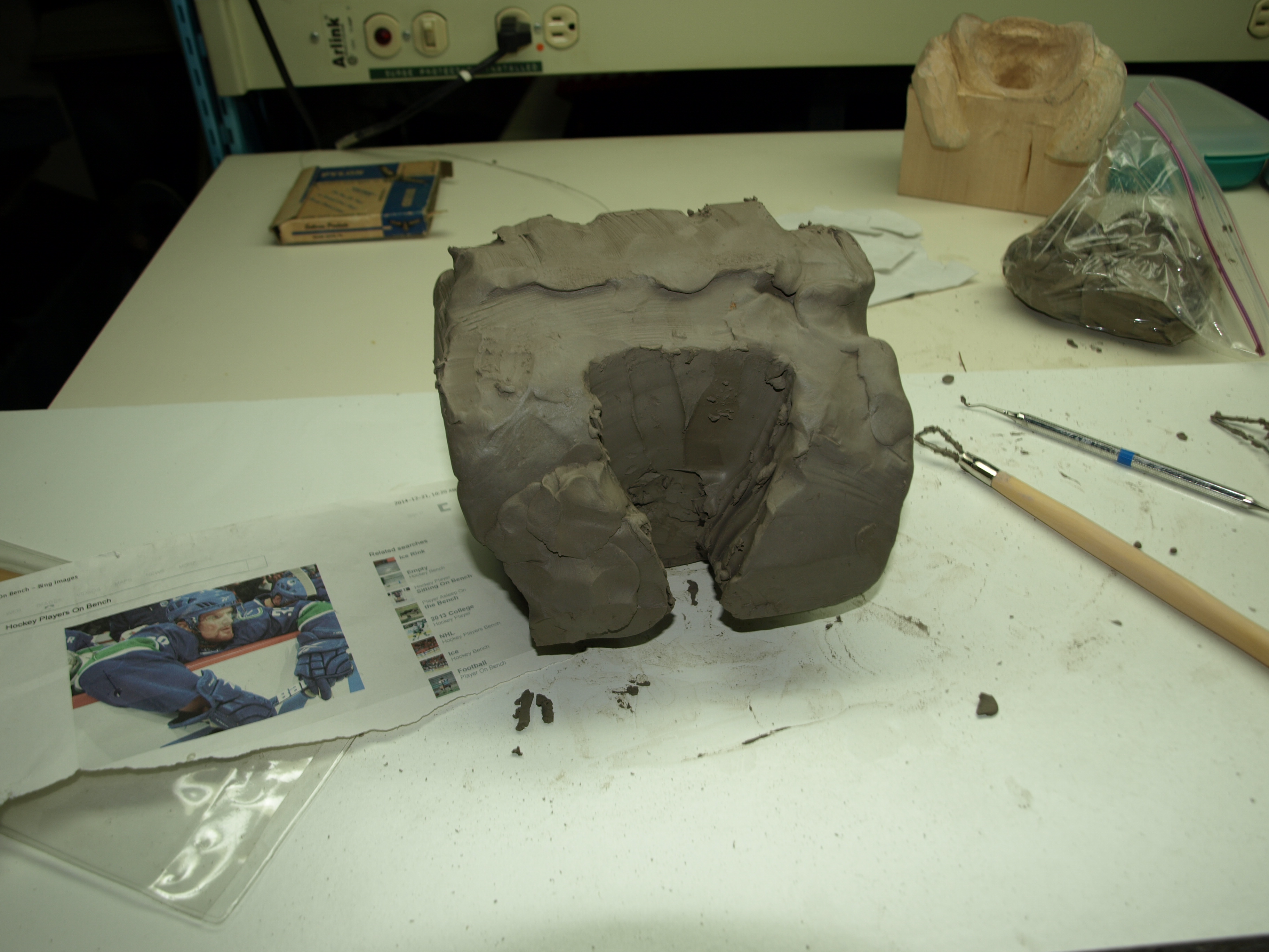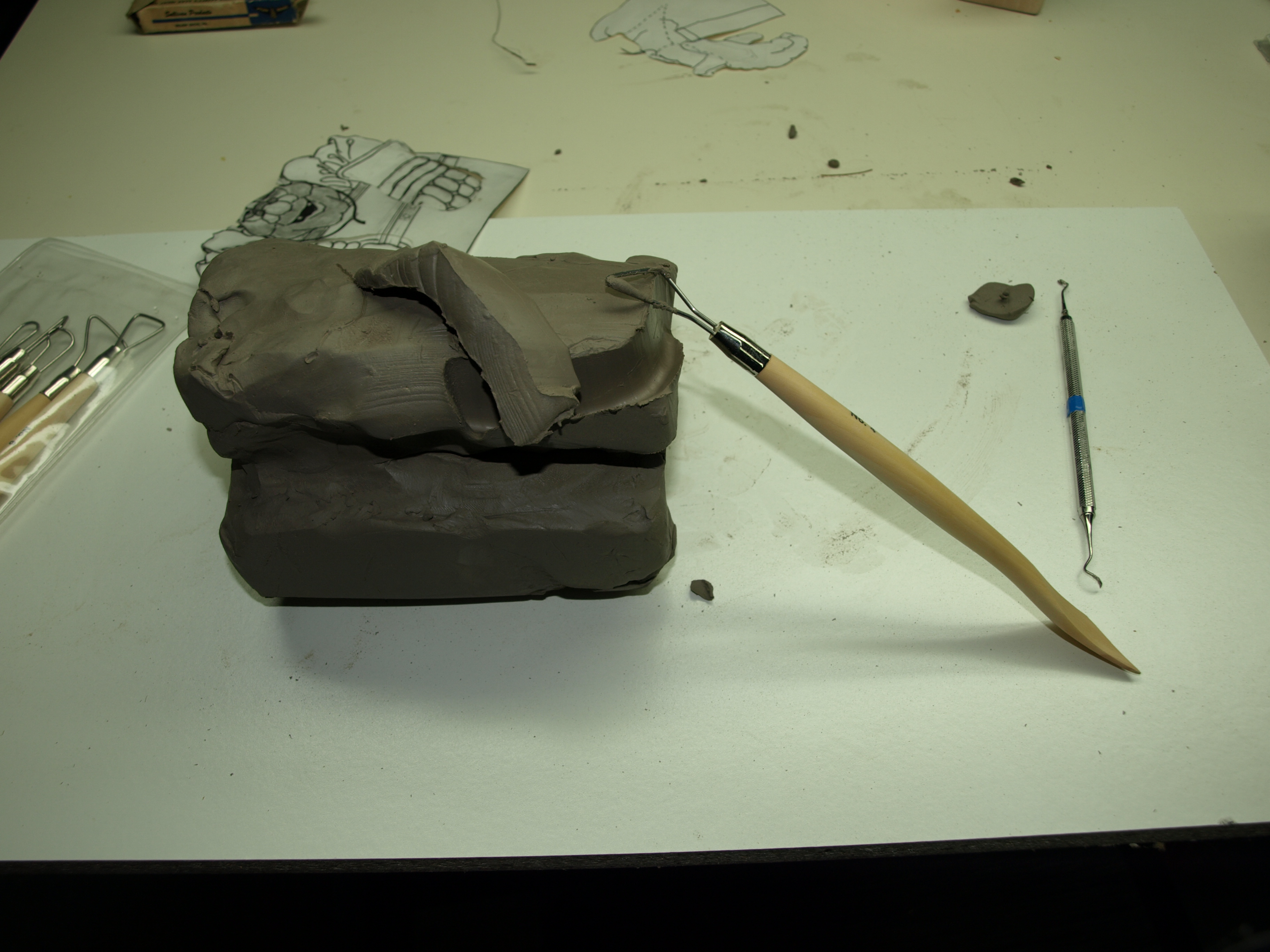 First step was to take my front and side view drawings that I had made and transfer them to the block of clay.  I’m not entirely sure if this is the right way to work clay, but it was similar to blocking wood out on a bandsaw…so I went with it.  I actually did the initial shaping against the drawing lines with a piece of wire and sort of “sawed” through the clay.  Then I used one of the tools ( which is basically a heavy loop of wire on the end of a stick ) to start removing some of the squareness of the clay cube.