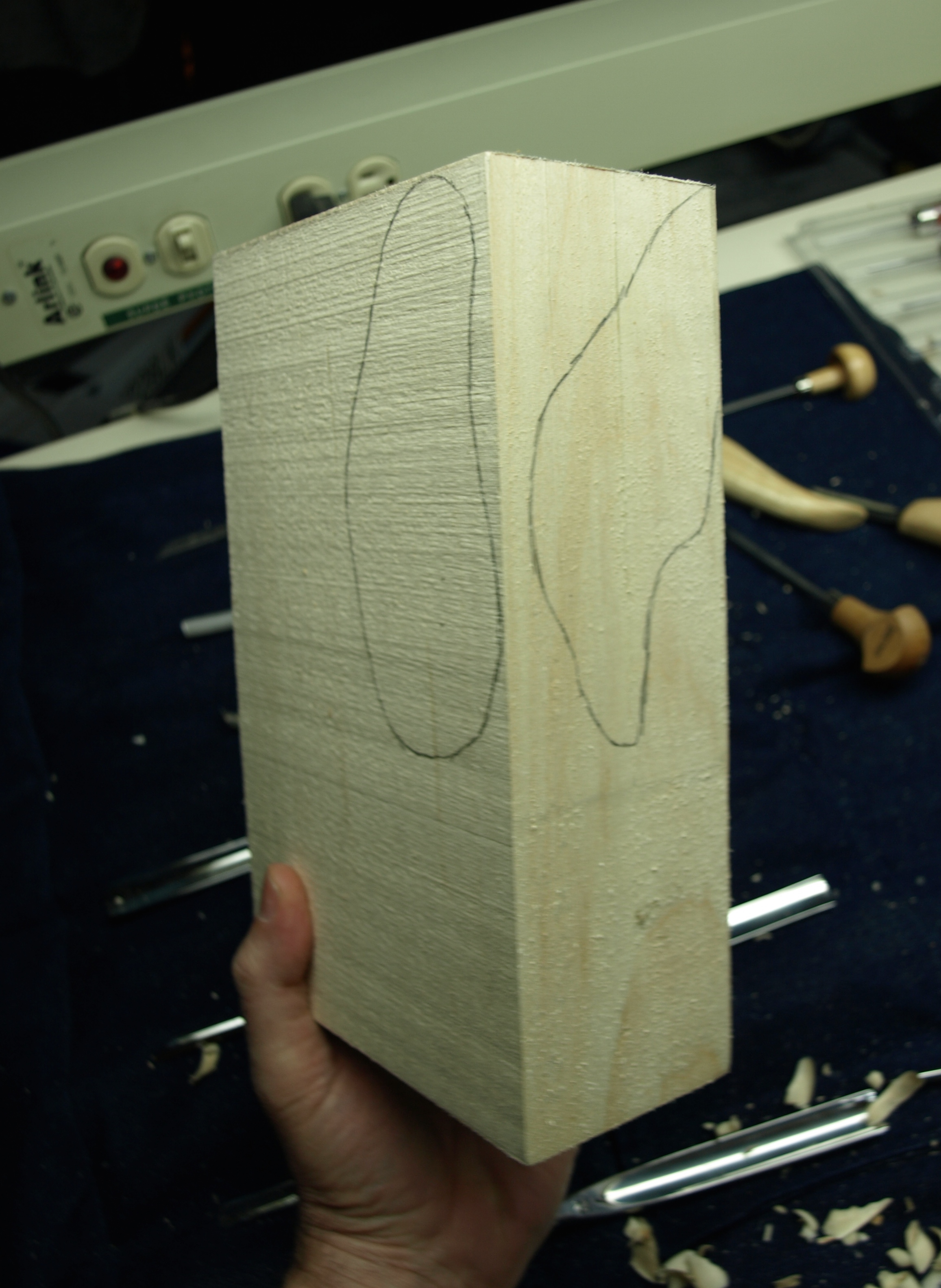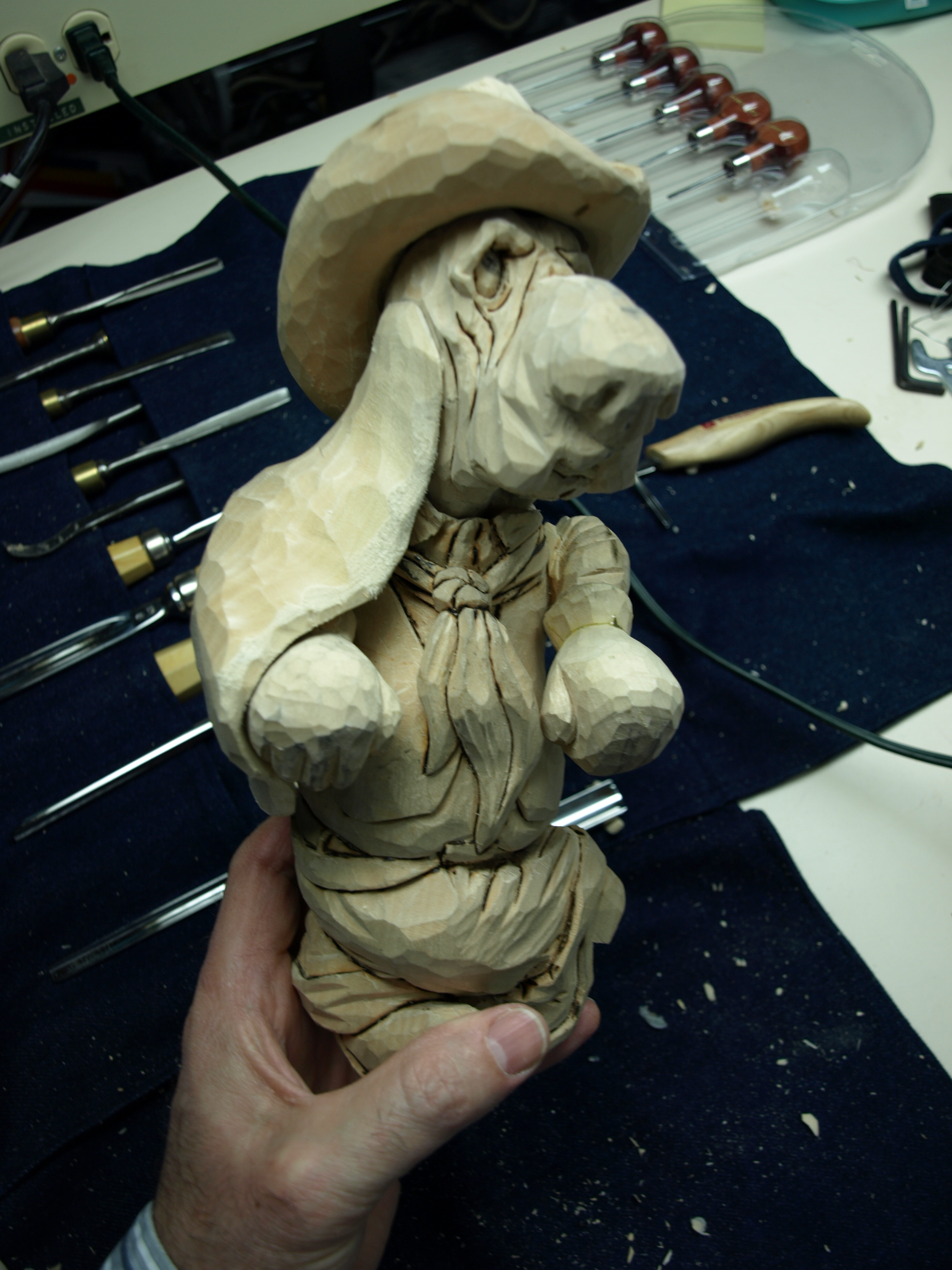 I made a fairly quick template out of paper just to get the general shape of the ear that would eventually curl around one arm and fall just short of the six-shooter.  After transferring a front and side view of this template to a piece of basswood ( thanks, Emily, for the basswood ), I rough cut it on the bandsaw and then did some minimal shaping with some carving tools.