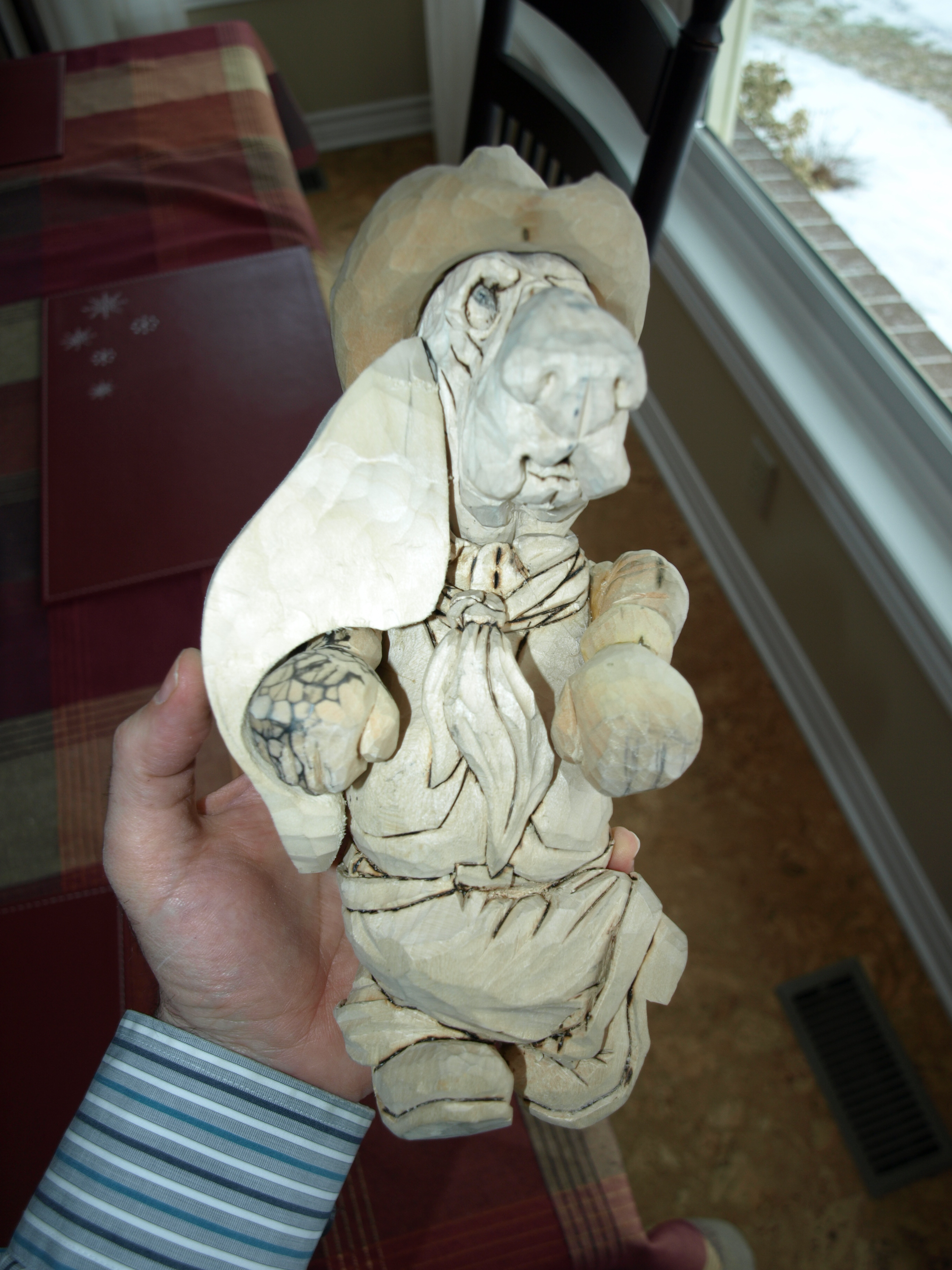 2. Thanks. I’ll post another photo shortly with both of the ears in place and trimmed a bit shorter. He’s looking pretty good and I’m enjoying the carving time. If this snow ever goes away I’ll be able to get outside and exercise this back of mine doing some yard work.