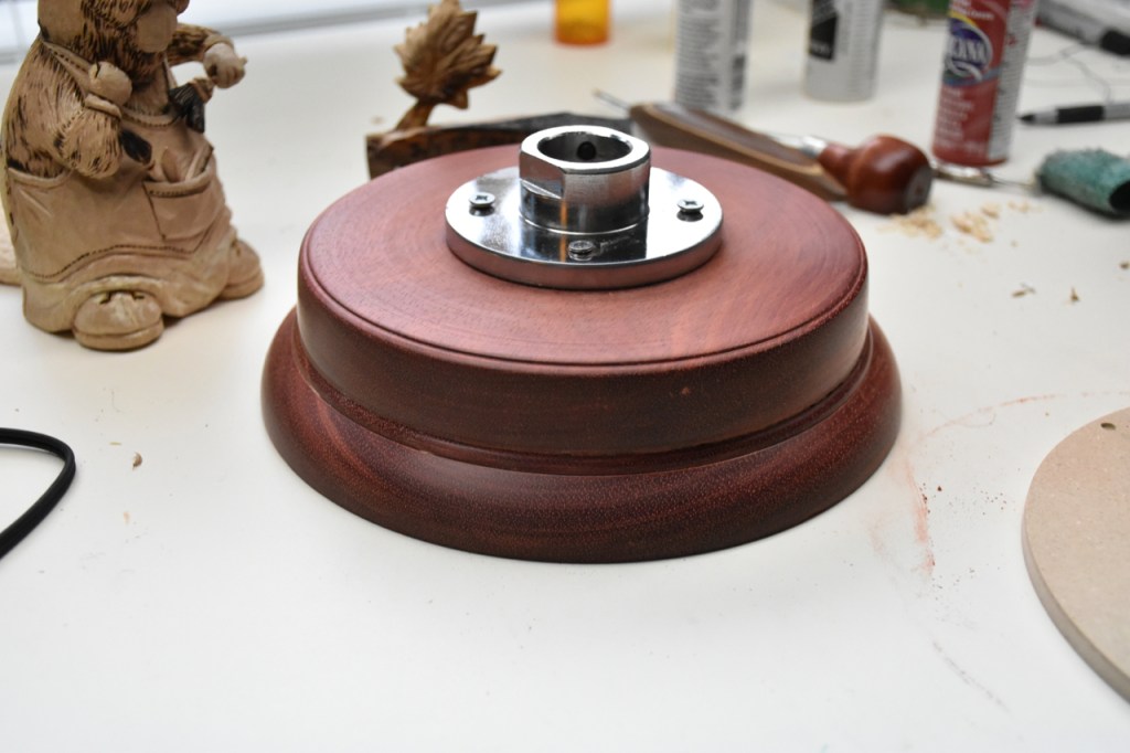 The base was made on a lathe from two pieces of Bloodwood ( beautiful grain ) laminated together and hollowed out like a bowl to accommodate a music box. I used water based Carpenter’s Glue to glue down some sawdust and wood chips on the top of the base where the little beaver had been doing his carving.