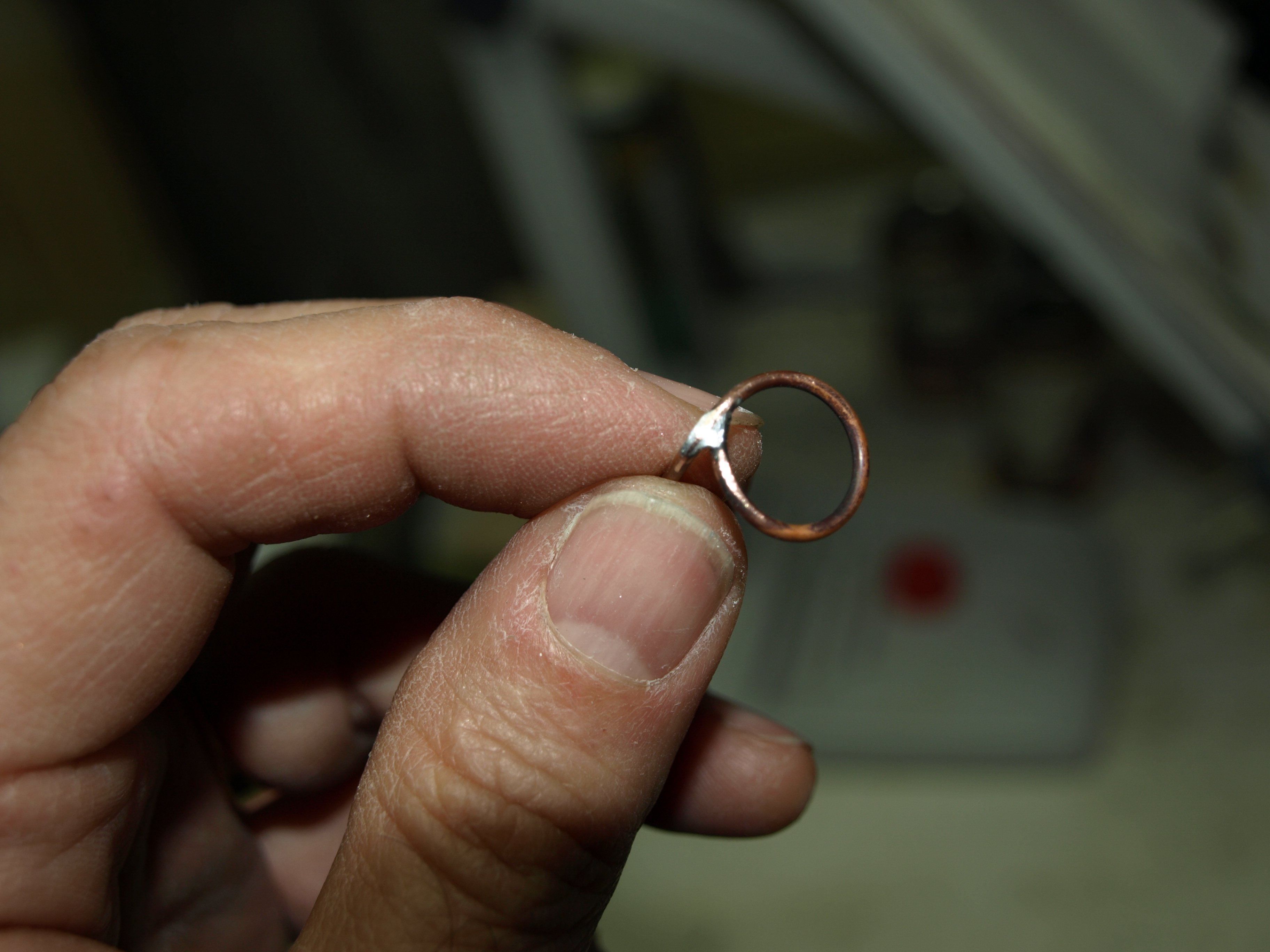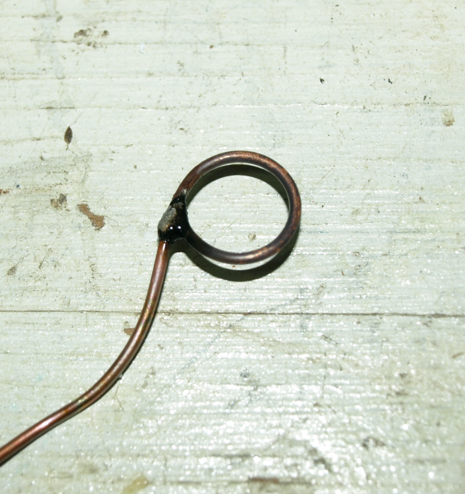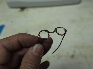 This is my first attempt at making some wire frame glasses to go along with a wood carving. I started by making a round loop in some copper wire by wrapping some soft copper wire around a dowel of suitable diameter. I then used a very fine saw that I have to “miter” cut the excess wire so that I’d end up with a fine and tapered joint to solder against. I left enough excess wire to fashion the arms of the glasses.
