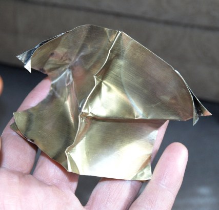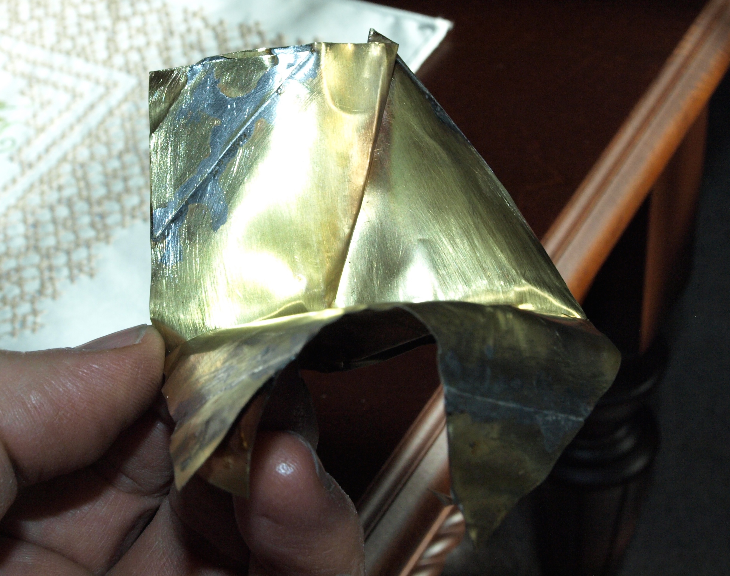 I actually started by taking some aluminum tape and doubling it up. I then bent ( easily ) the tape into the size and shape that I wanted for the newspaper…wrinkles and creases included…and used this as a mock-up for the stiffer and more difficult to shape brass.