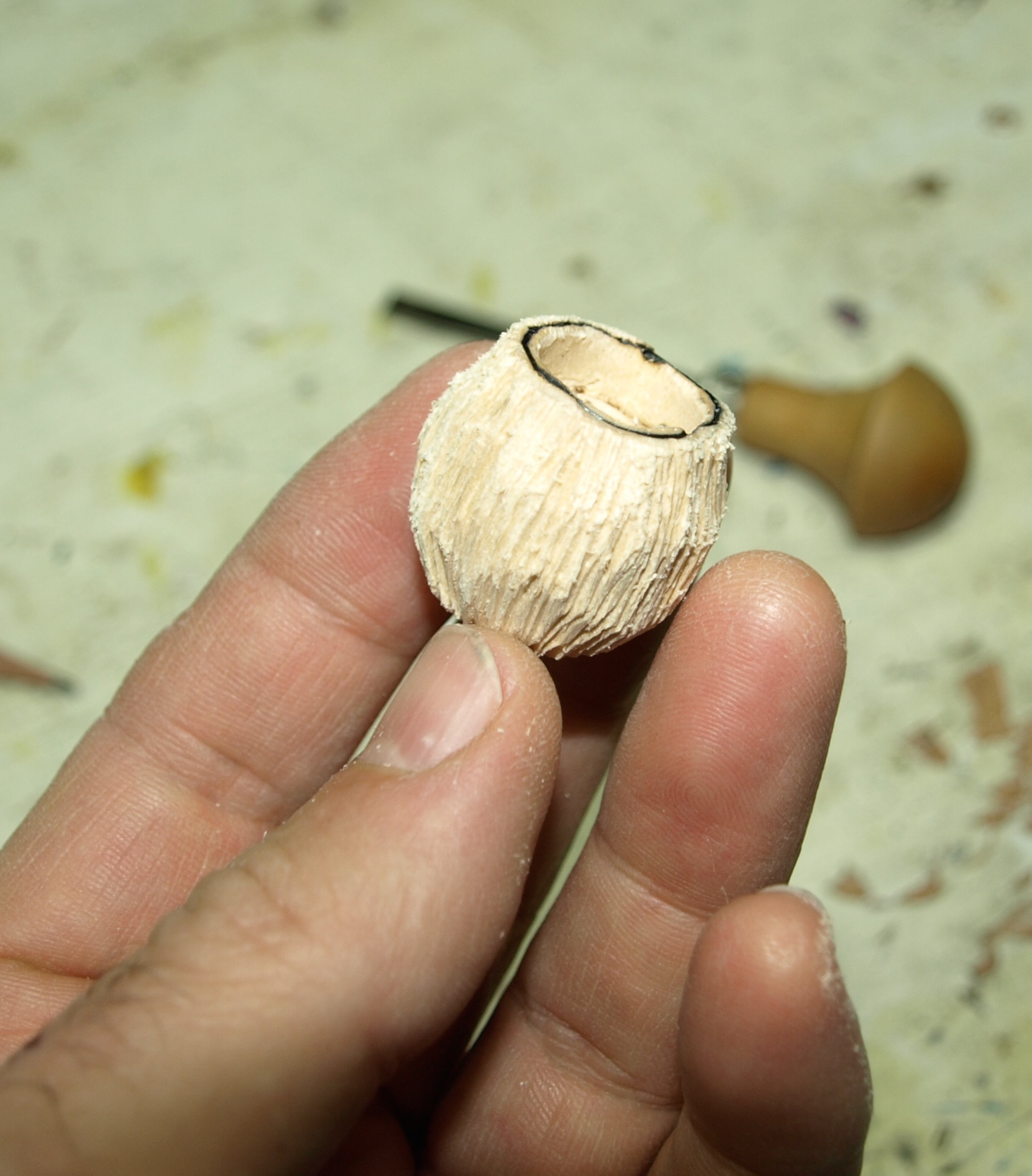 A few steps…the coconut was carved and then just roughed up a bit with a typhoon bit on a foredom tool to give the coconut some “fuzz.” It was painted with brown acrylic and then dry brushed with a lighter brown for highlights.