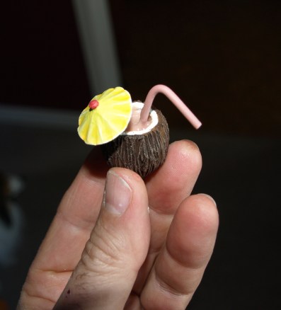 The drink in the coconut was made from epoxy mixed with some flour ( to give it some “foam” ) and a bit of pink acrylic paint.