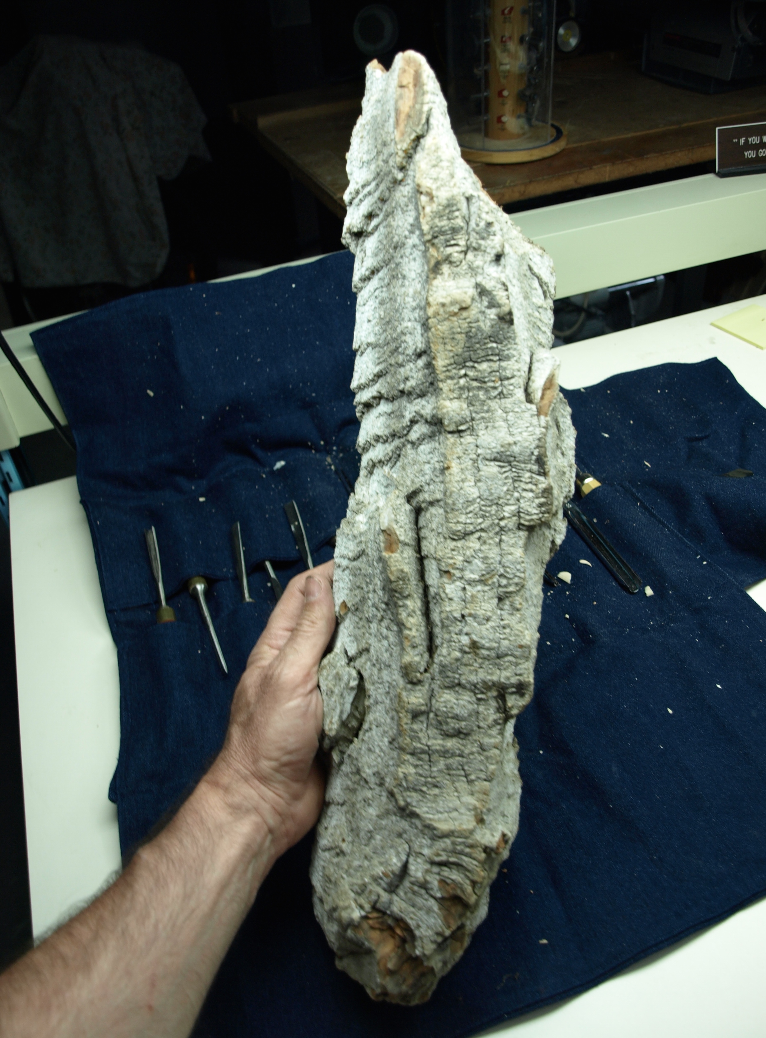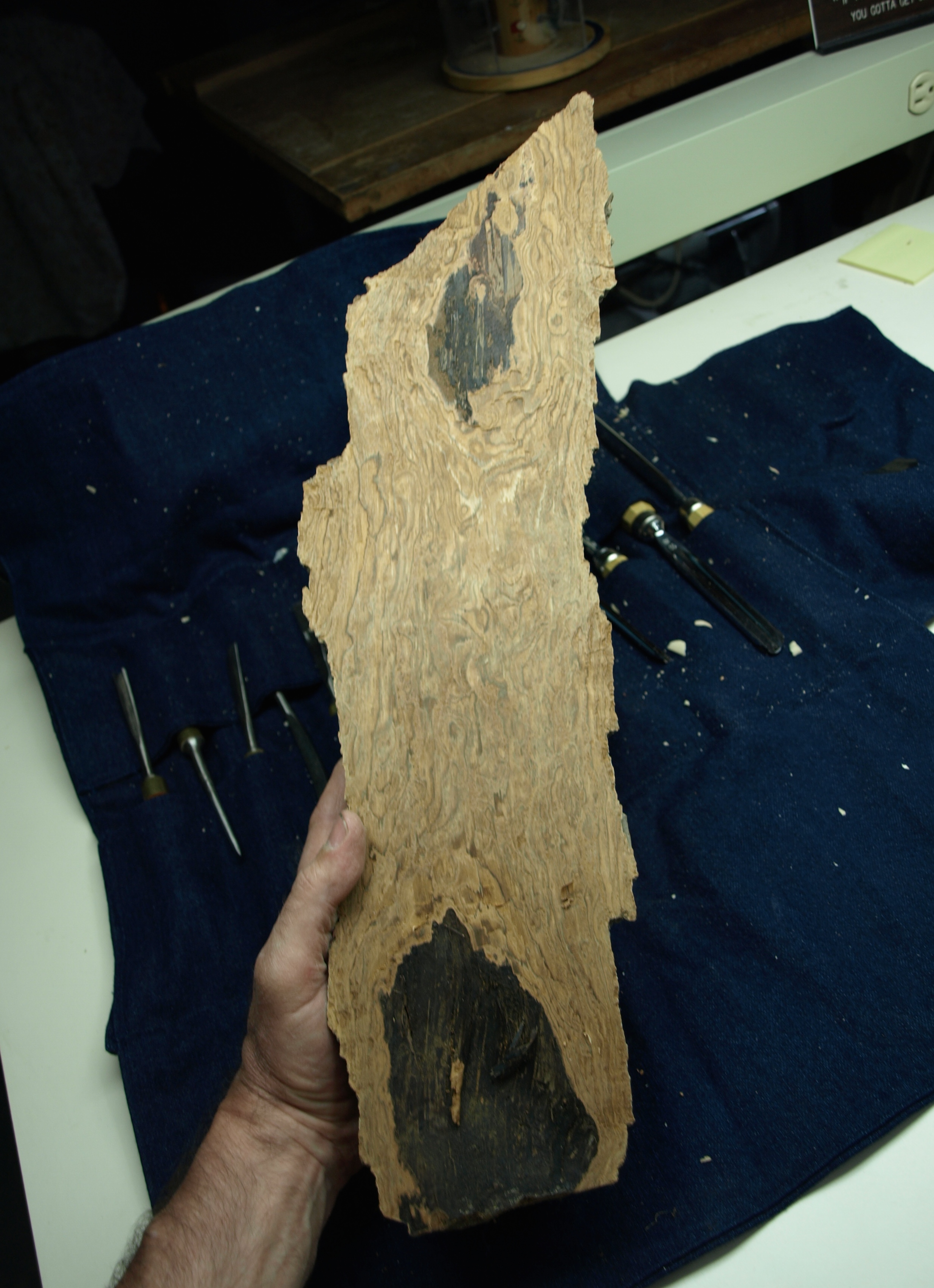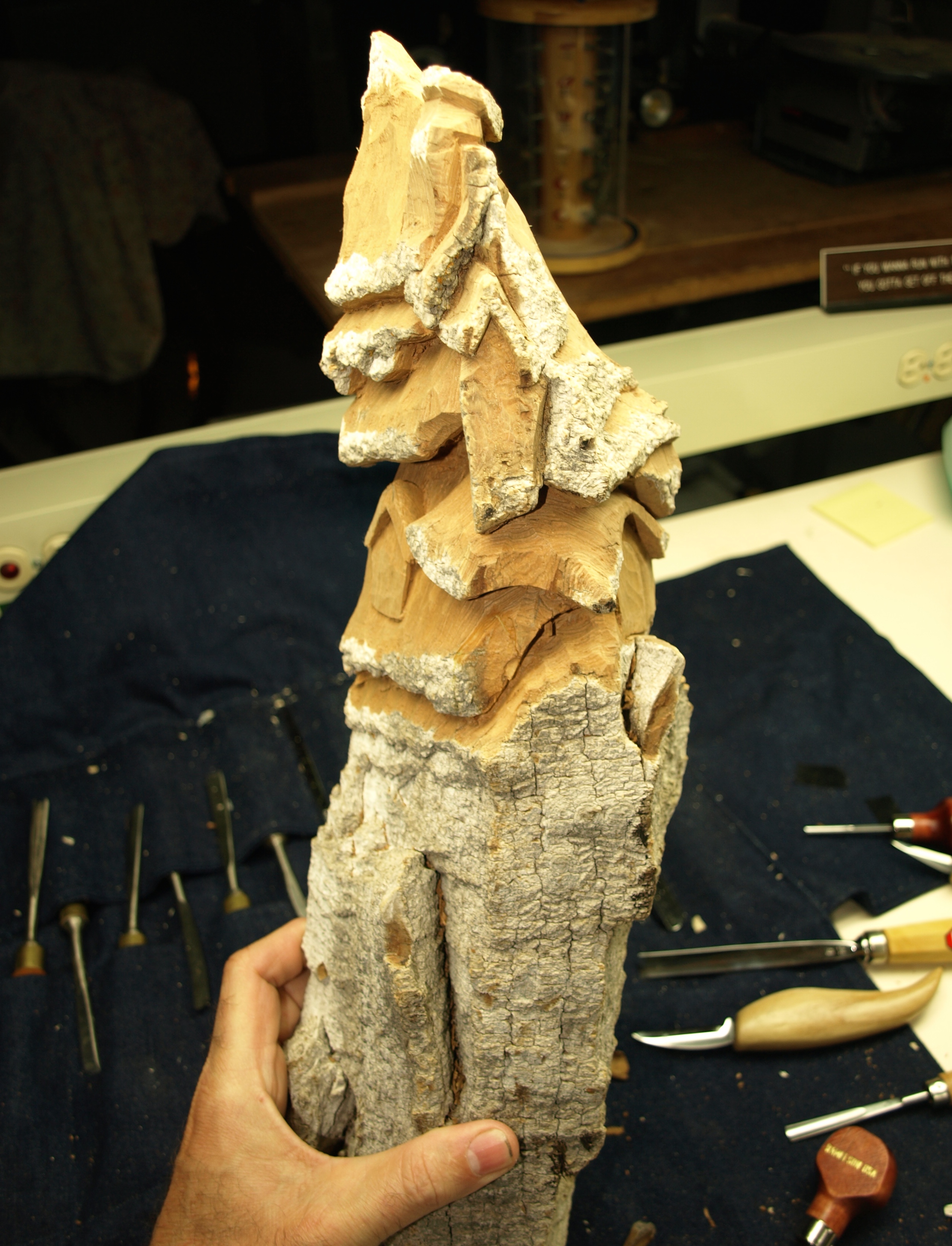 I should mention, that the “back” of the bark, or the piece against the tree, is first planed down a bit to get a flat rather than a concave surface so that when it’s finished as a wall hanging the carving sits flat against the wall.