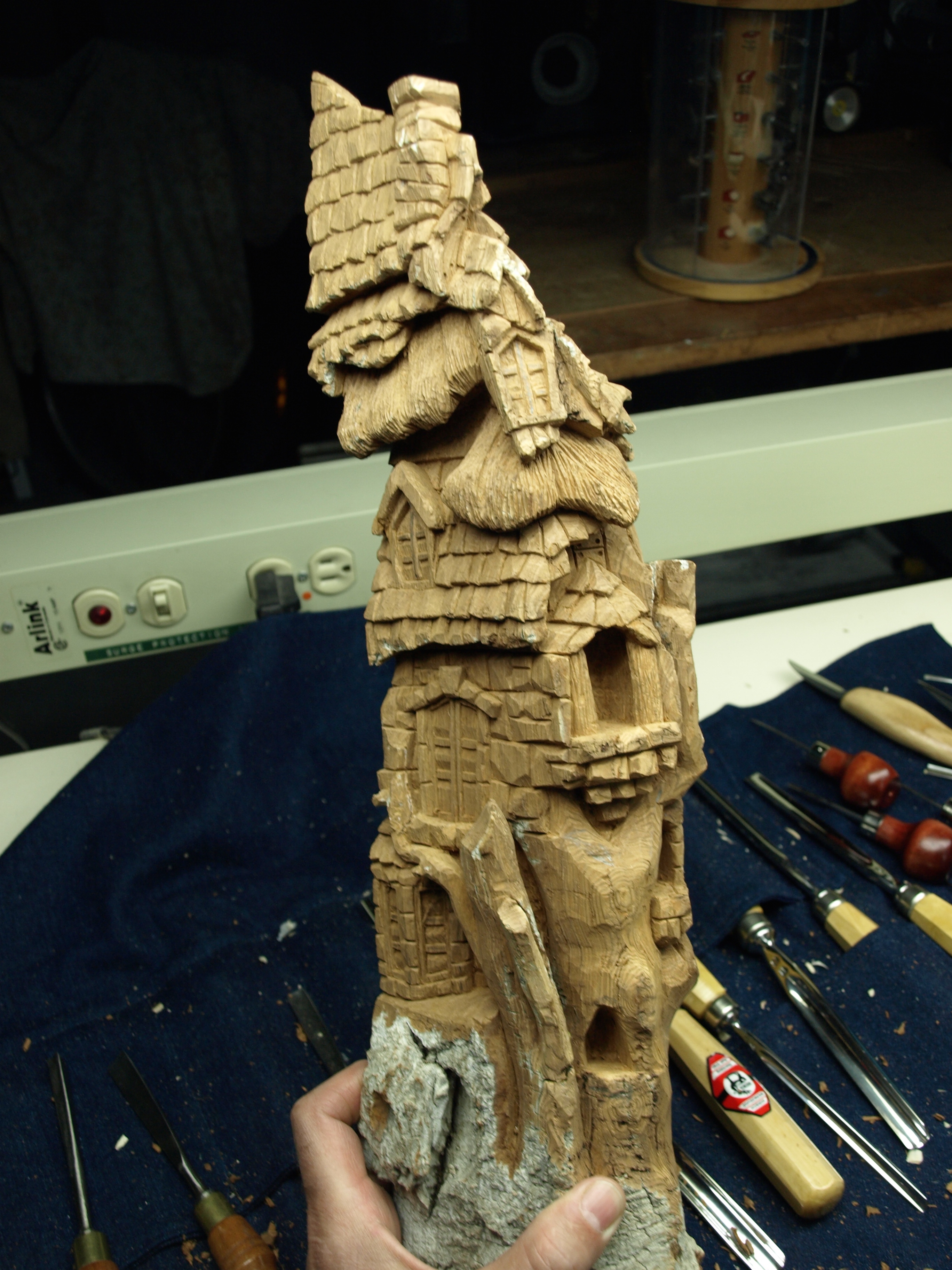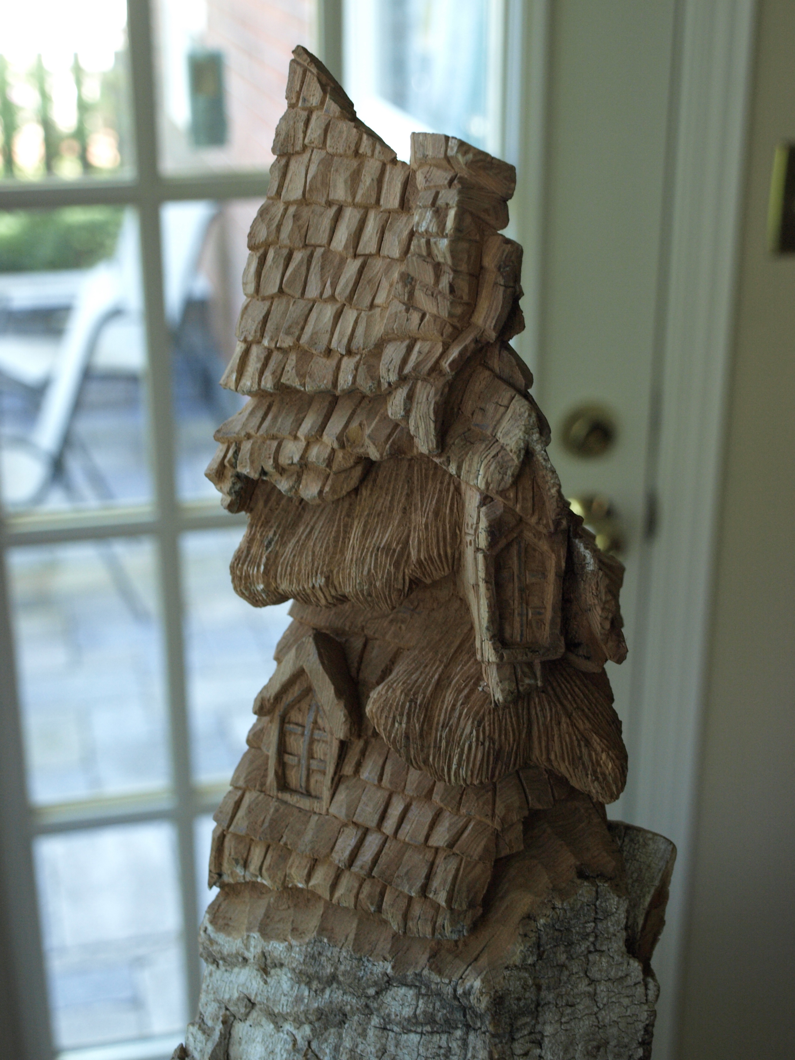So, given that, I started with just roughing in the roof line and a few doors and windows. Today I’ve done a bit more on the cedar roof shingles and detailed in one of the dormer windows. Kind of mindless, relaxing carving and a break from pulling weeds.