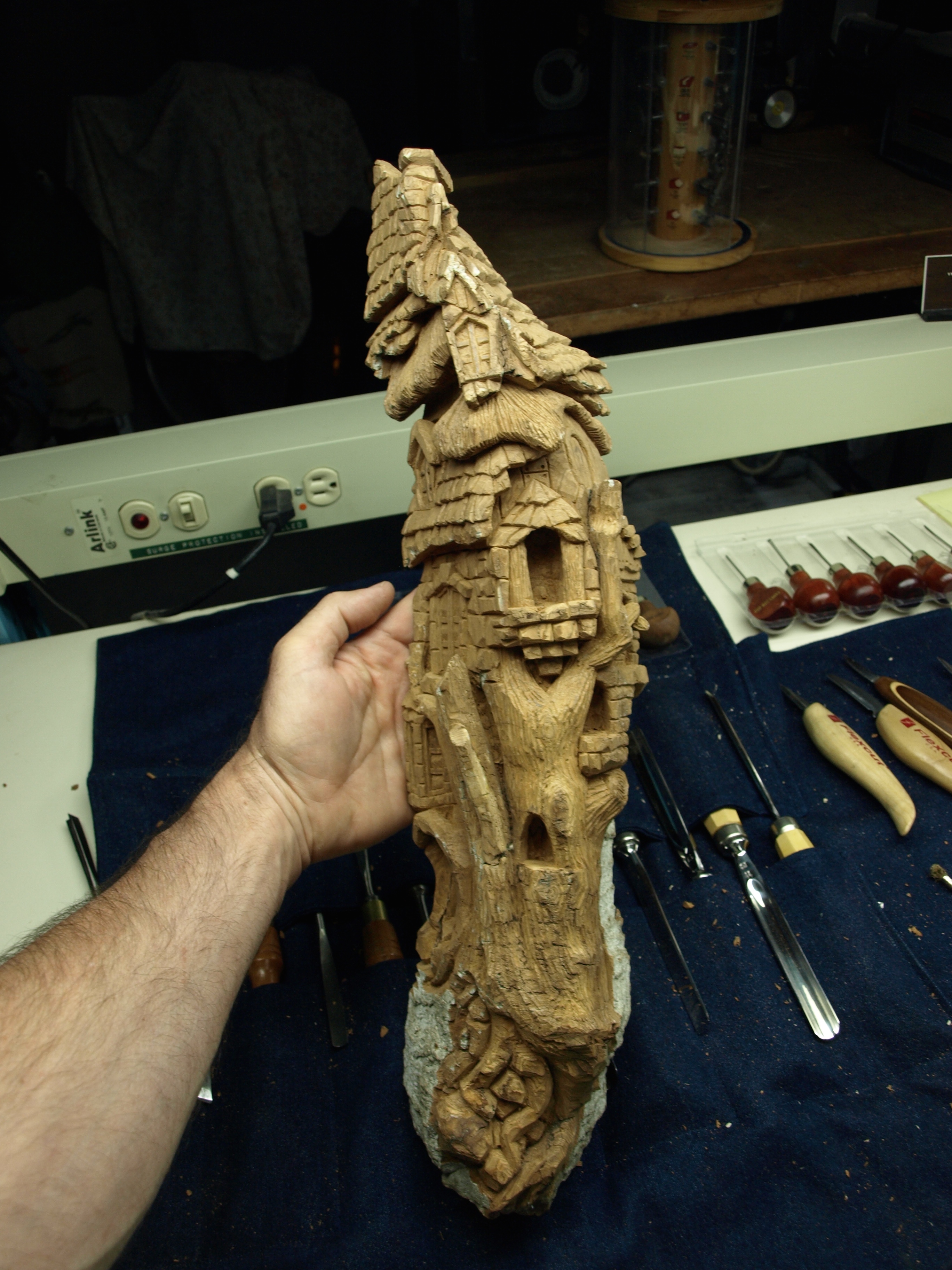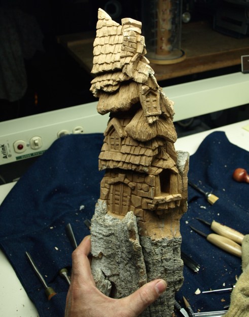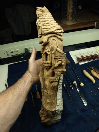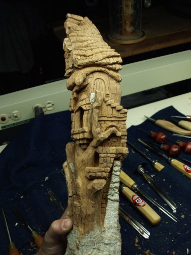 This one is already taking on the characteristics of a cabin in the woods. In this case, the cabin is actually going to be on the woods in that it’ll be on the top of an old rotting tree surrounded by rock cliffs. Hey…you take a look at the bark and try to imagine what’s inside it’s basic shape…and that’s what was there.