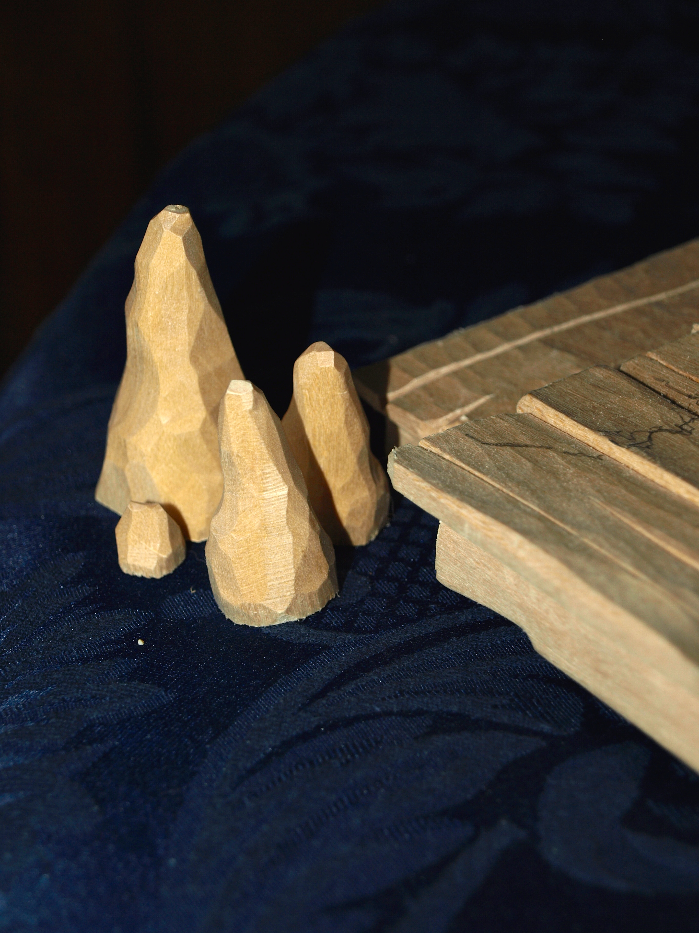 For a little added interest, there’s now a plank missing on the dock and you’re able to see the cross members and “water” beneath the structure. That was fun to carve…I used a scroll saw to cut through the dock and then dressed up the details with a carving knife.