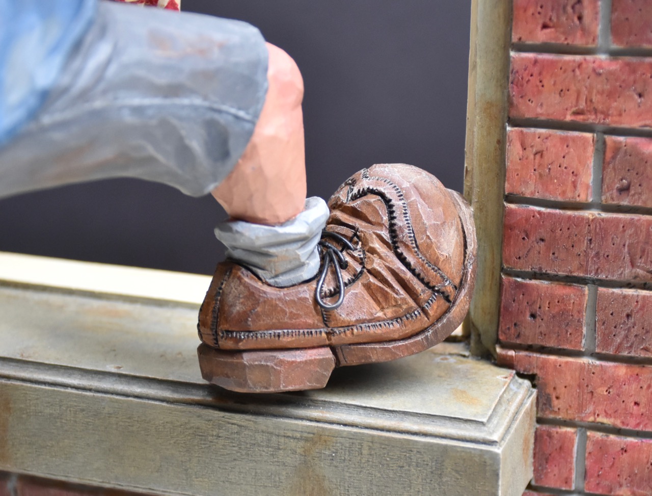 I had some fun in carving the rag that the window cleaner is using. I should mention that the little fellow has adopted the name of Wendell. He looks like Mervin from Mervin-the-Mover fame and we suspect that they’re probably brothers.