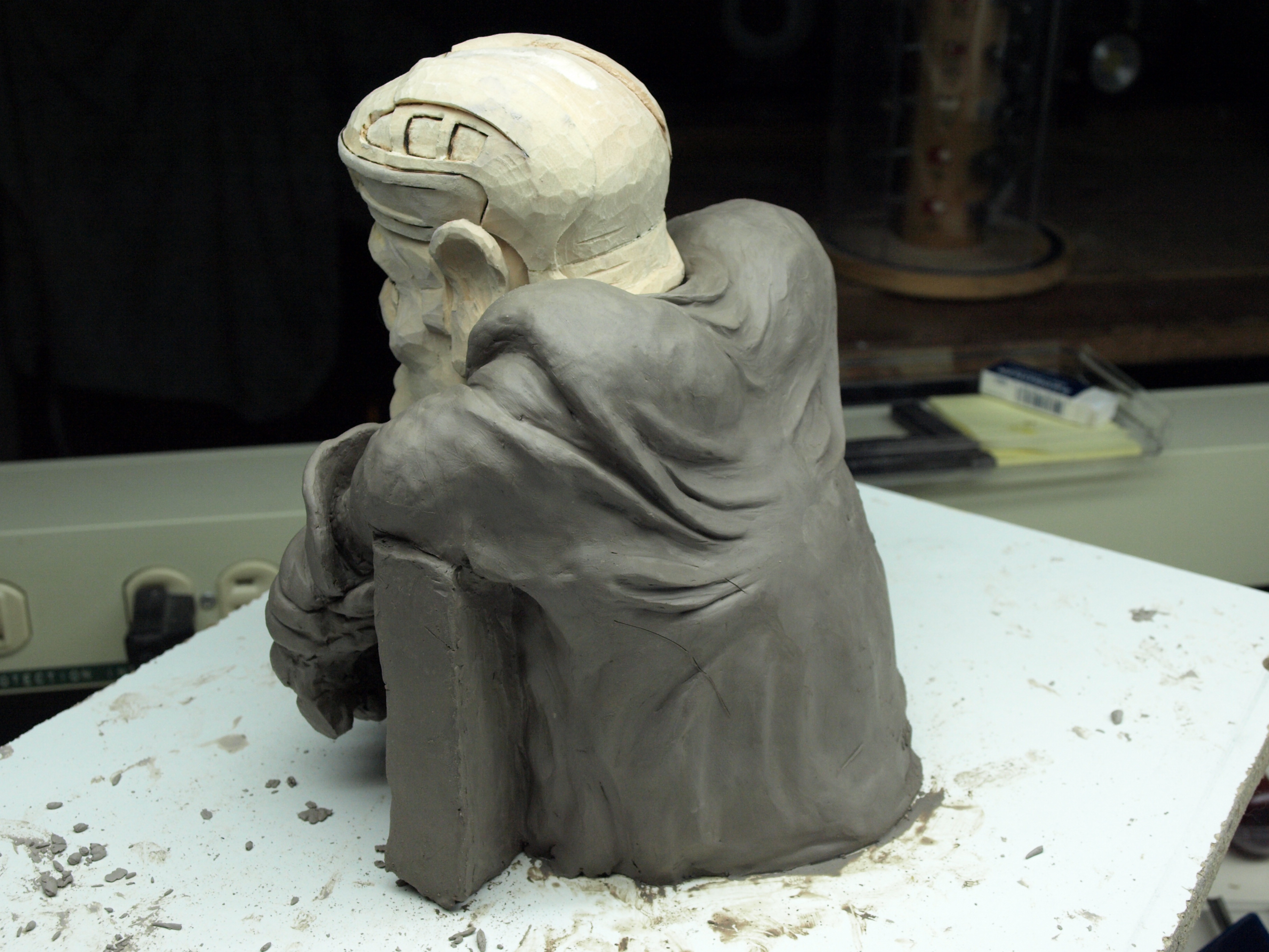 At this point, I’ve included both gloves and have started on some wrinkles on this arm and around his shoulder pads.  It’s kind of time consuming and I’m not sure that I’d want to do the clay work for every carving that I take on…but, in this case, the extra work is fun and useful.