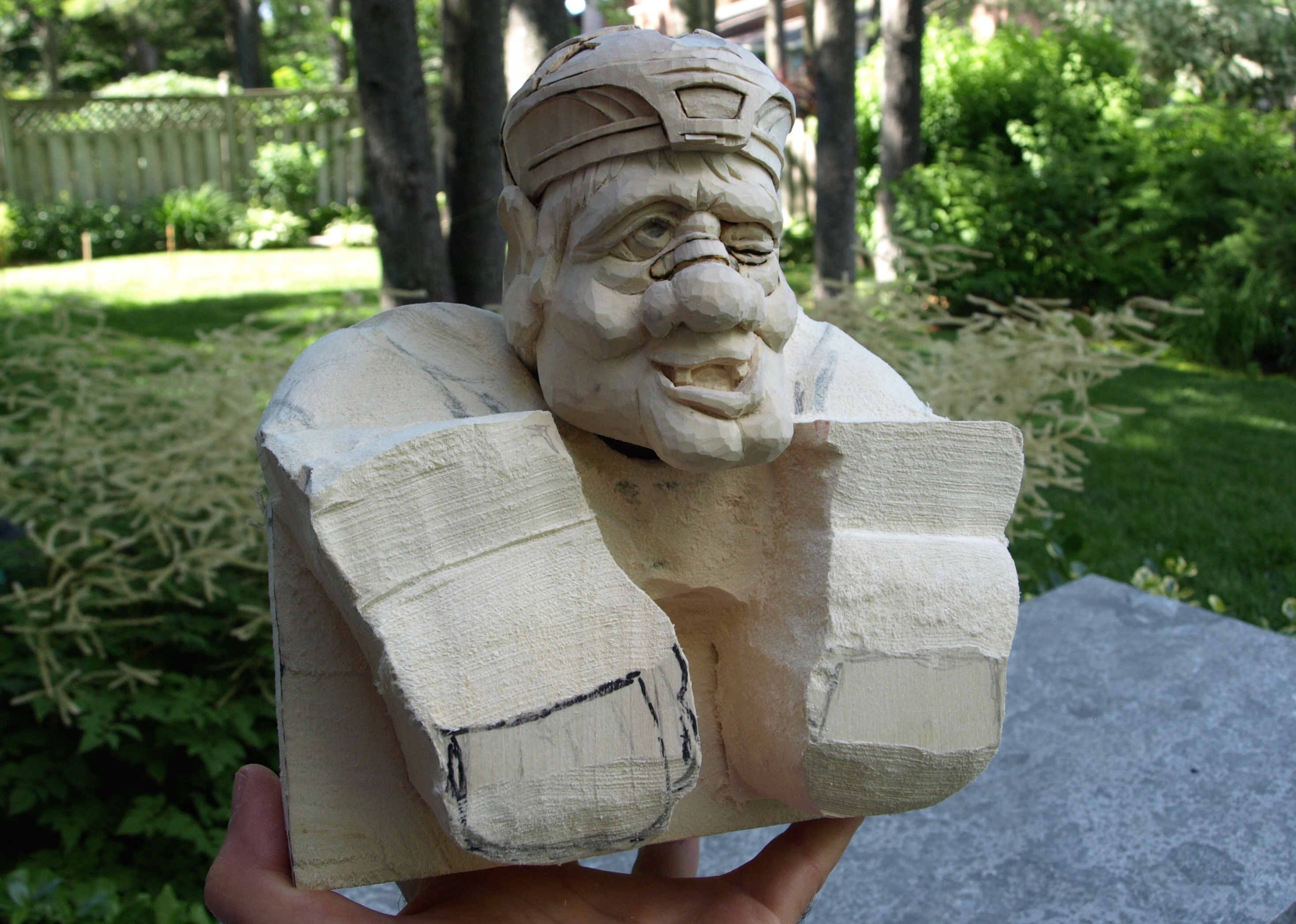 You’ll recall that this carving of the happily beaten up hockey player will be called “Two Minutes for Fighting” and will feature our hero spending that time in the penalty box.  The clay torso and penalty box boards were a result of a not-so-very-successful job at trying to carve his posture just using the two dimensional drawing that I sketched up.  This three dimensional clay sculpture is really helping me bring this little guy to life.