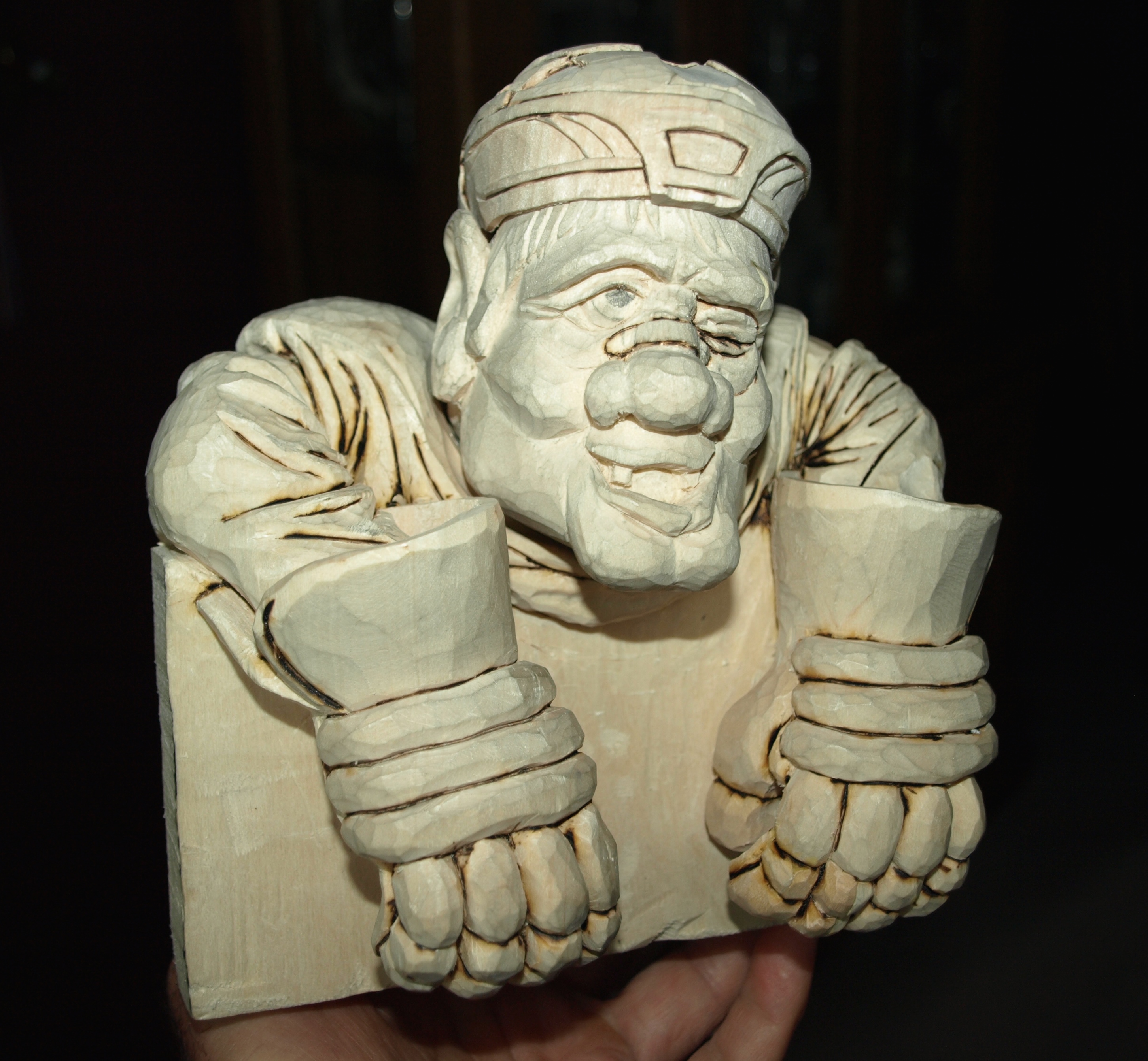 I’ve pretty much completed the hockey gloves on this carving.  Right now he just happens to be holding a chopstick…but, that’ll change to a hockey stick at some point soon!