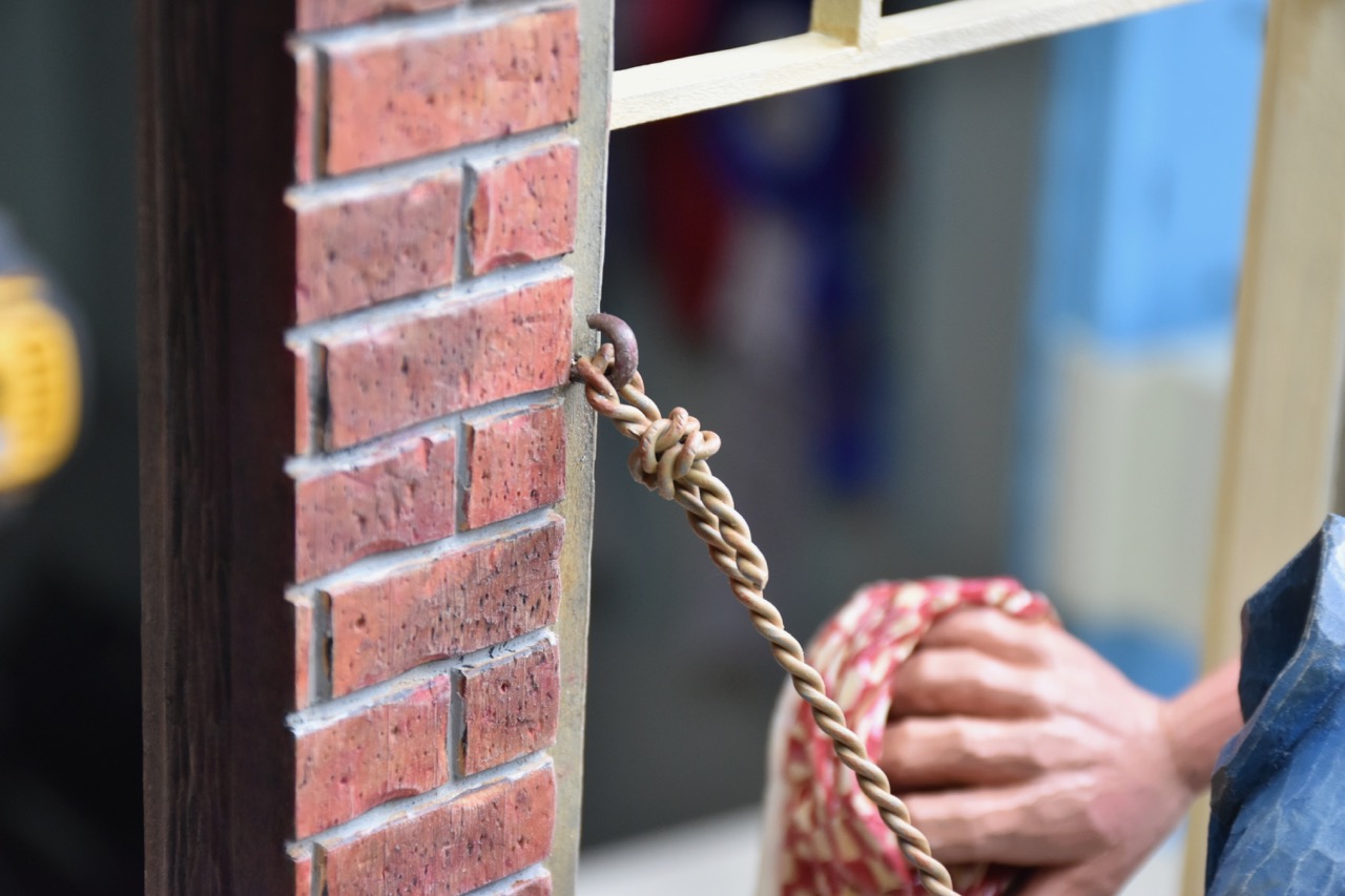 The hooks that were glued in place on the window sills are cotter pins that were cut in half.
