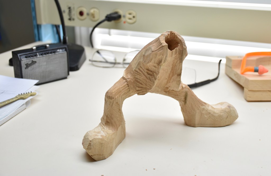 Again, I started with a quick clay model and then used it to make a very simple line diagram on the front and side of a block of basswood that I brought to the bandsaw to do its magic. After some roughing out with a Foredom tool equipped with a very aggressive Typhoon bit ( and, again, be careful using these ), this is what the rough-out looked like. I had already carved the head for this piece, so I just drilled an oversized hole for its placement.