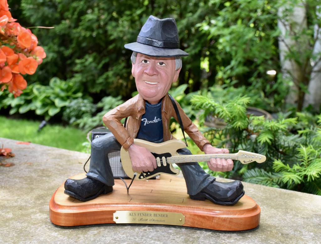 I started with a few photos that Pat sent me and downloaded a few additional photos of the Fender Stratocaster and amplifier that Al owns. Once again, I did the figure in clay and then used the clay figure as a model for the carving. The clay work was particularly helpful when modelling the face…I think that I would have gone through a lot of failed attempts if I had tried to do the initial resemblance in wood!