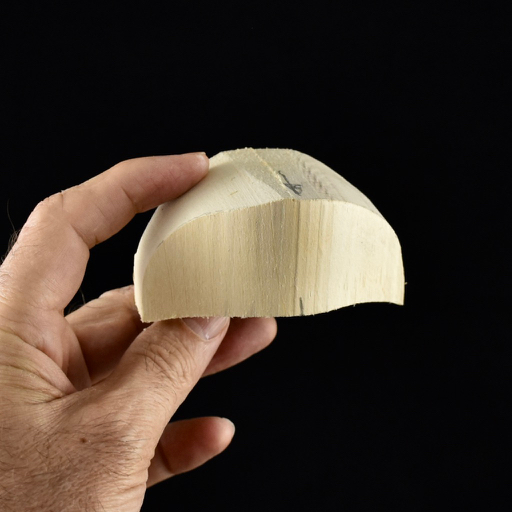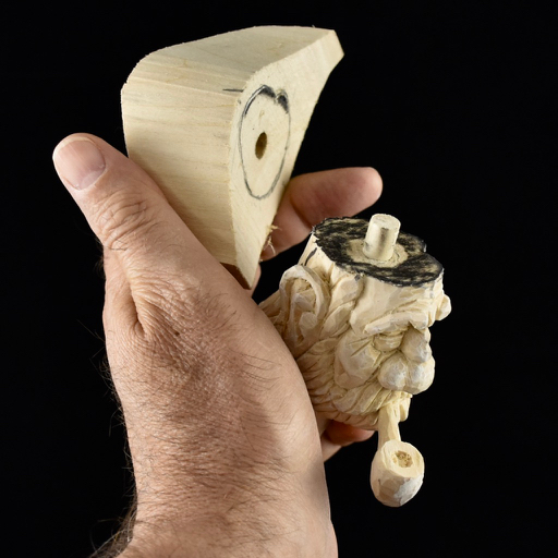 The hat was created in the usual manner with the crown and brim separate so that the grain matched the strongest direction. The head is cut away to accept the brim of the hat.