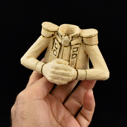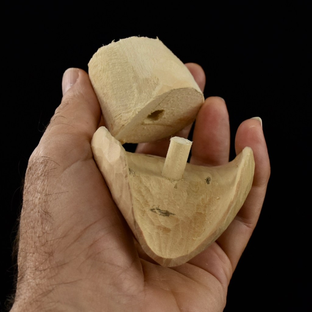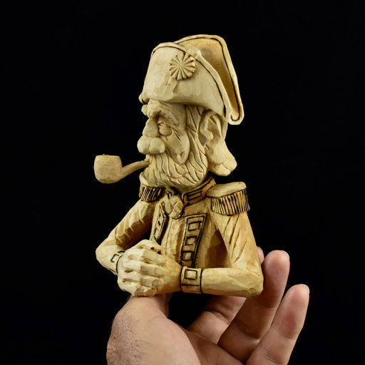 From there, a combination of a Foredom “Typhoon” bit followed with a knife and gouge resulted in the basic hat and body. By the way, I found out in the process that the hat is called a “bicorne”…didn’t know that. I used the usual method of transferring lead pencil markings from the head to the hat to seat the hat very precisely on the head. Check out one of Lynn Doughty’s great videos on Outwestwoodcarving if you need a bit more of an explanation on this method. You can see that I also used a burning tool to clean things up as I went.
