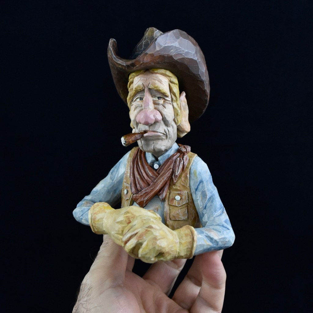 Then, with knives and a few small gouges, I started adding detail. The neckerchief, gloves and vest were a must for this ranch-hand. I used a dilute coat of urethane over the entire carving to seal things up and to harden any “fuzzy” sections that I later sanded lightly away.
