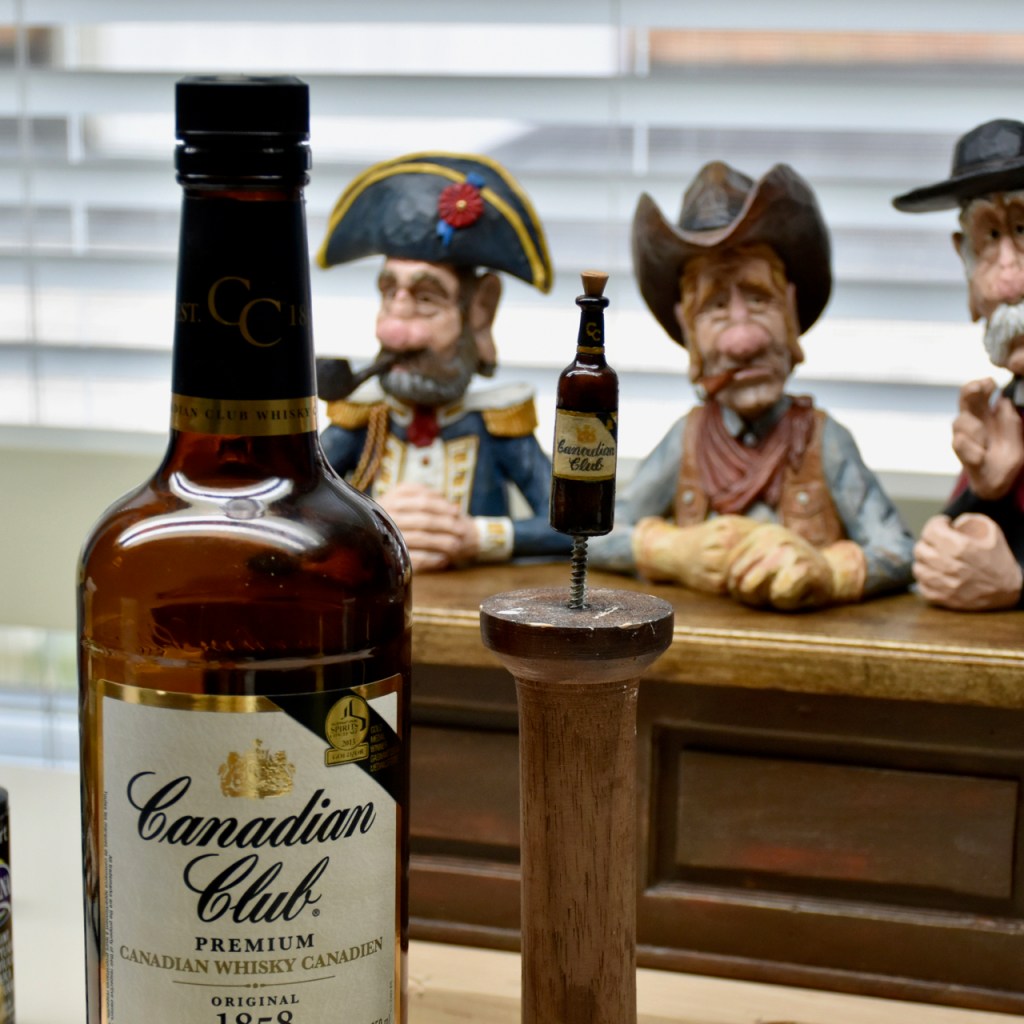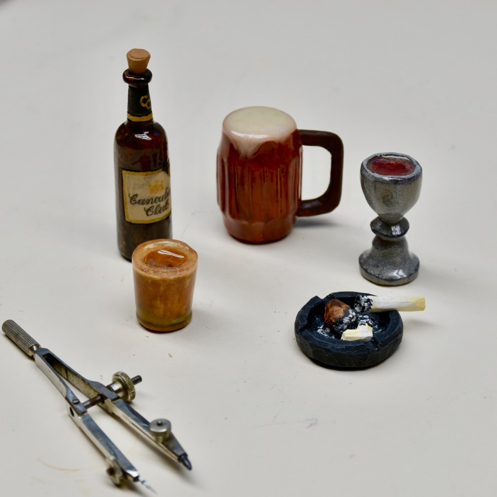 Well, first you start by putting a bottle on your work table. Then, without touching the bottle, you carve the shape of the bottle and then sand it. After you sand it and, again, without touching the bottle, you use some asphaltum, burnt umber and black to get the right shade of the bottle. Then ( don’t touch the bottle ), you use a light beige to create the label and outline it in gold. And then, with a soft HB pencil, you draw in the label script. Apply a bit of satin urethane on the painted label and paint the rest of the bottle with 30 minute epoxy to give it a nice gloss.