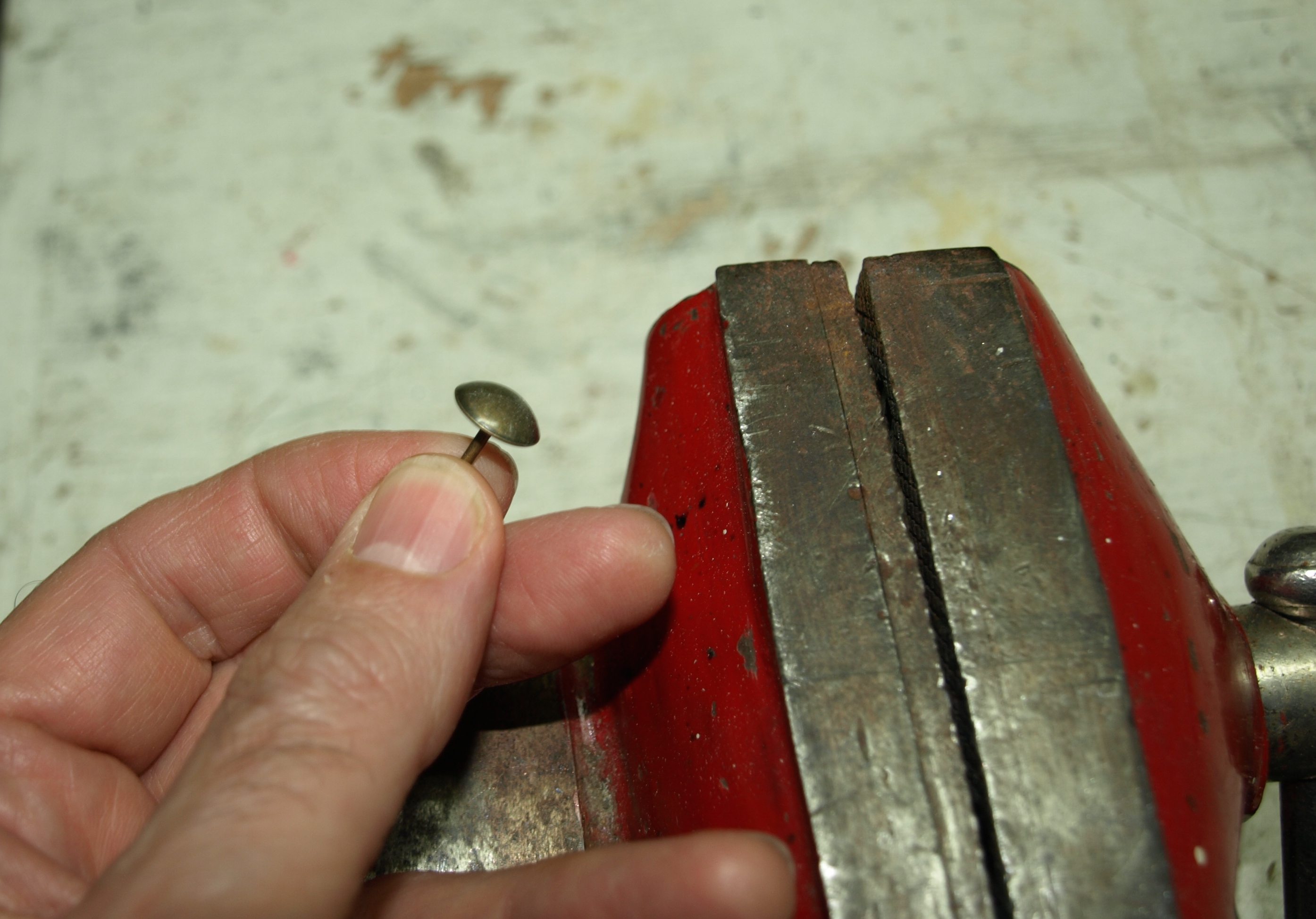 I started with a couple of brass tacks I found in a shop drawer. I flattened them out in a vice to learn that the tack pin is actually a nail with a head. That little nail ended up being a nice “axle” for a spinning spur.