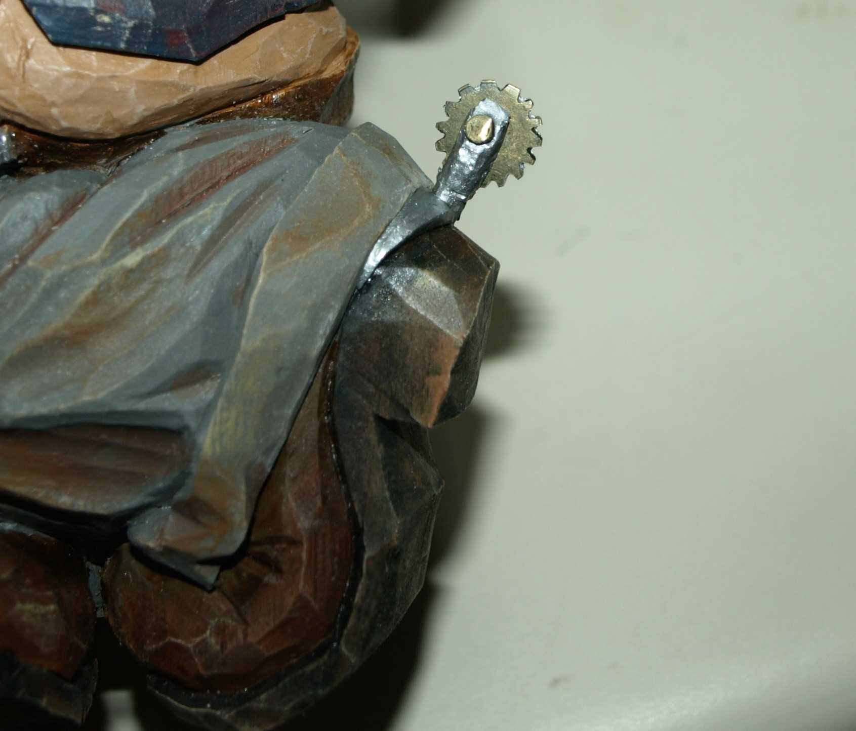 I used Asphaltum brown in several washes ( light, watered-down coats ) to build up the colour in the hat. I followed that up with a black head-band and then some dry brushing with a colour of Butterscotch. Remember that the dry-brushing is basically loading up your paint brush with the desired colour and then removing most of the paint onto paper towels before lightly brushing the carving with a light back and forth motion…think of it as a feather soft brushing of the carving. If you use a fat enough brush and a light touch, this leaves only a hint of colour on the highest points of the carving and leaves a sense of dust or wear.