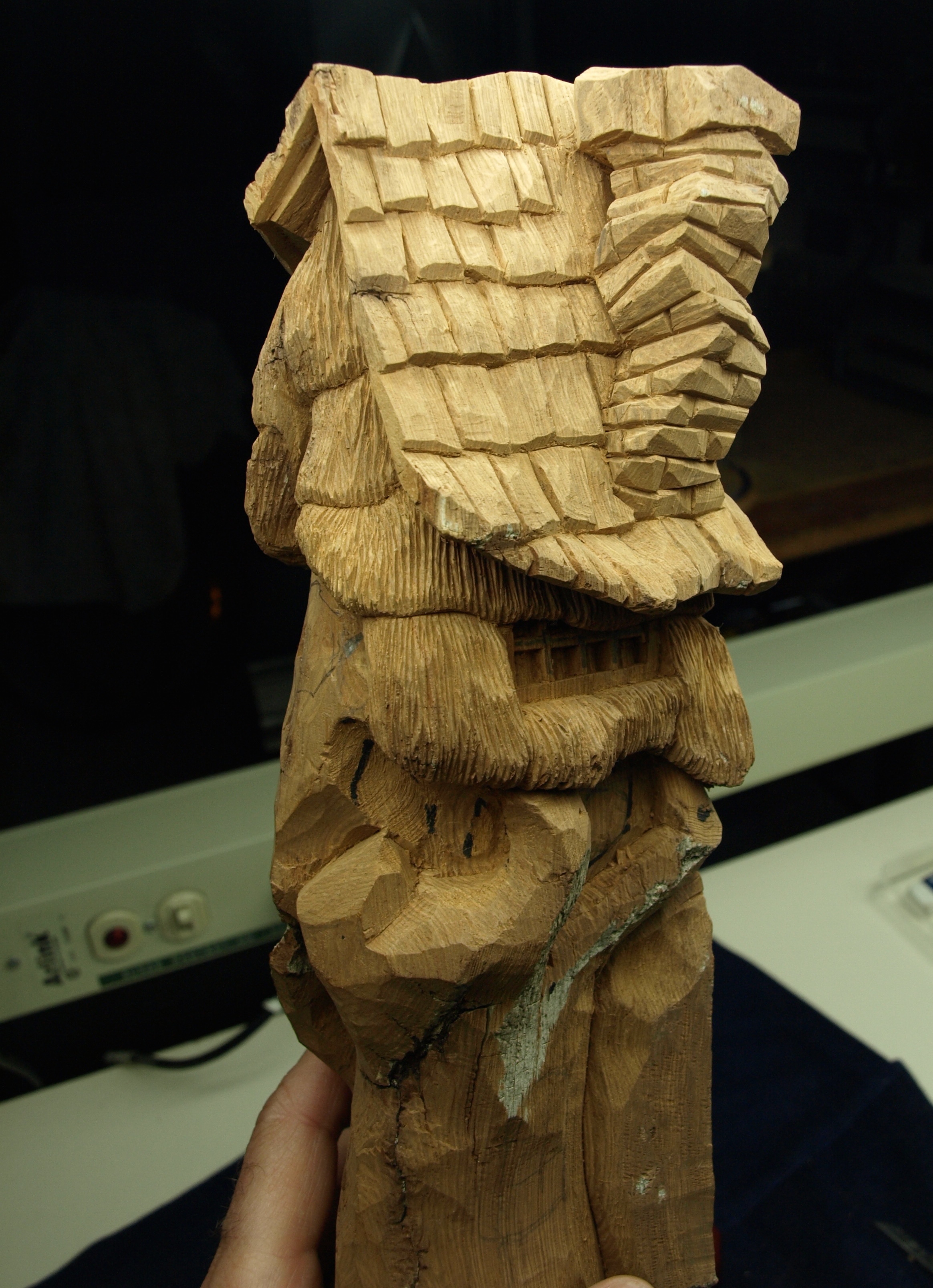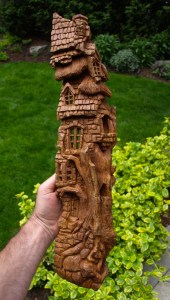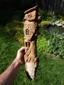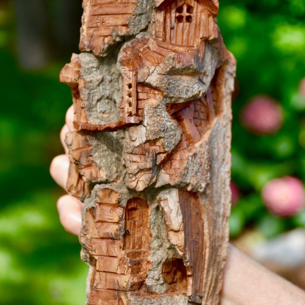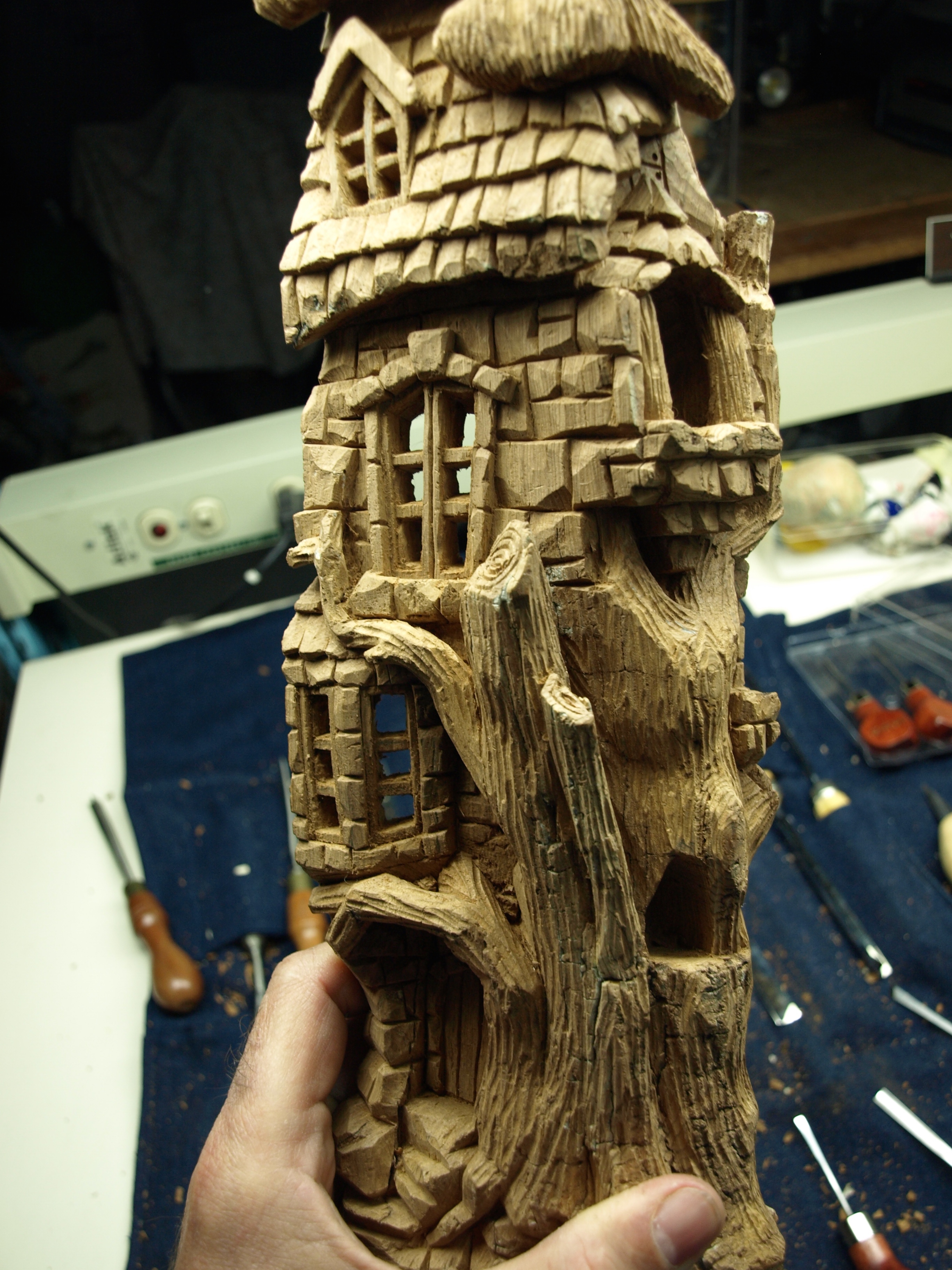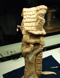 I’ve done a few Cottonwood Bark carvings that have incorporated lighthouses and I think that this may be my fourth or fifth. On this one, I decided to use some Cottonwood Bark from the west coast that was considerably thicker than I’ve used in the past. It turned out that the bark was quite a bit harder than the one’s that I’ve carved so far, so I made good use of a Foredom tool with a Typhoon ( carbide ) bit for the initial roughing out.