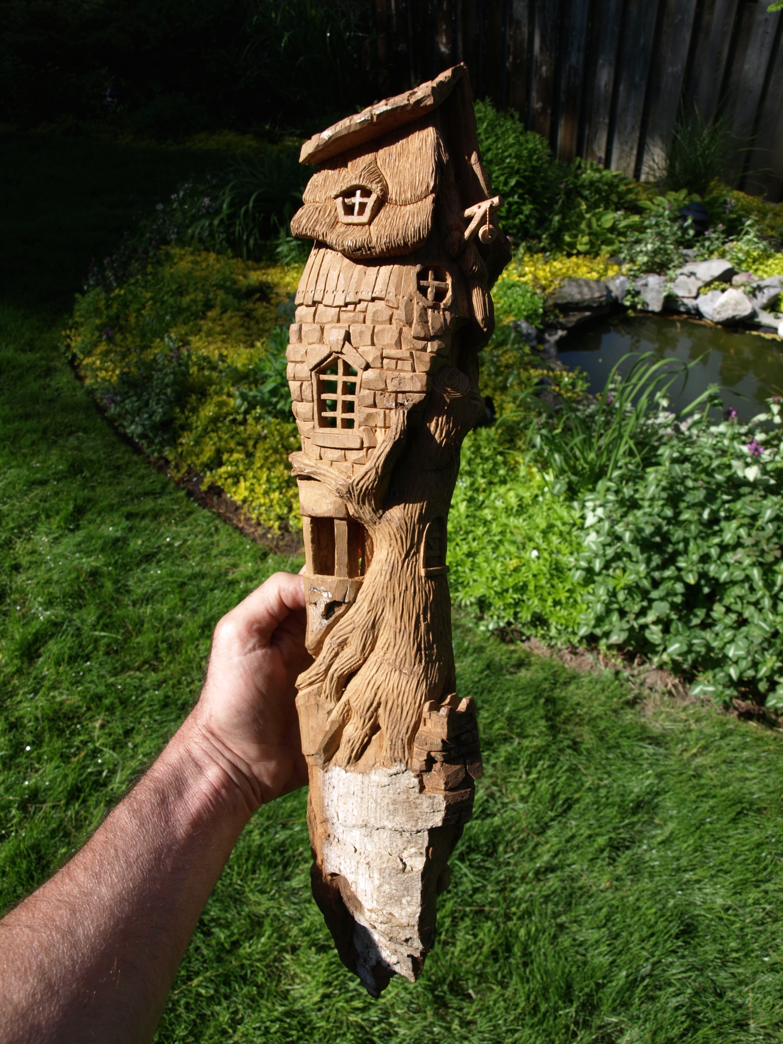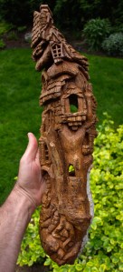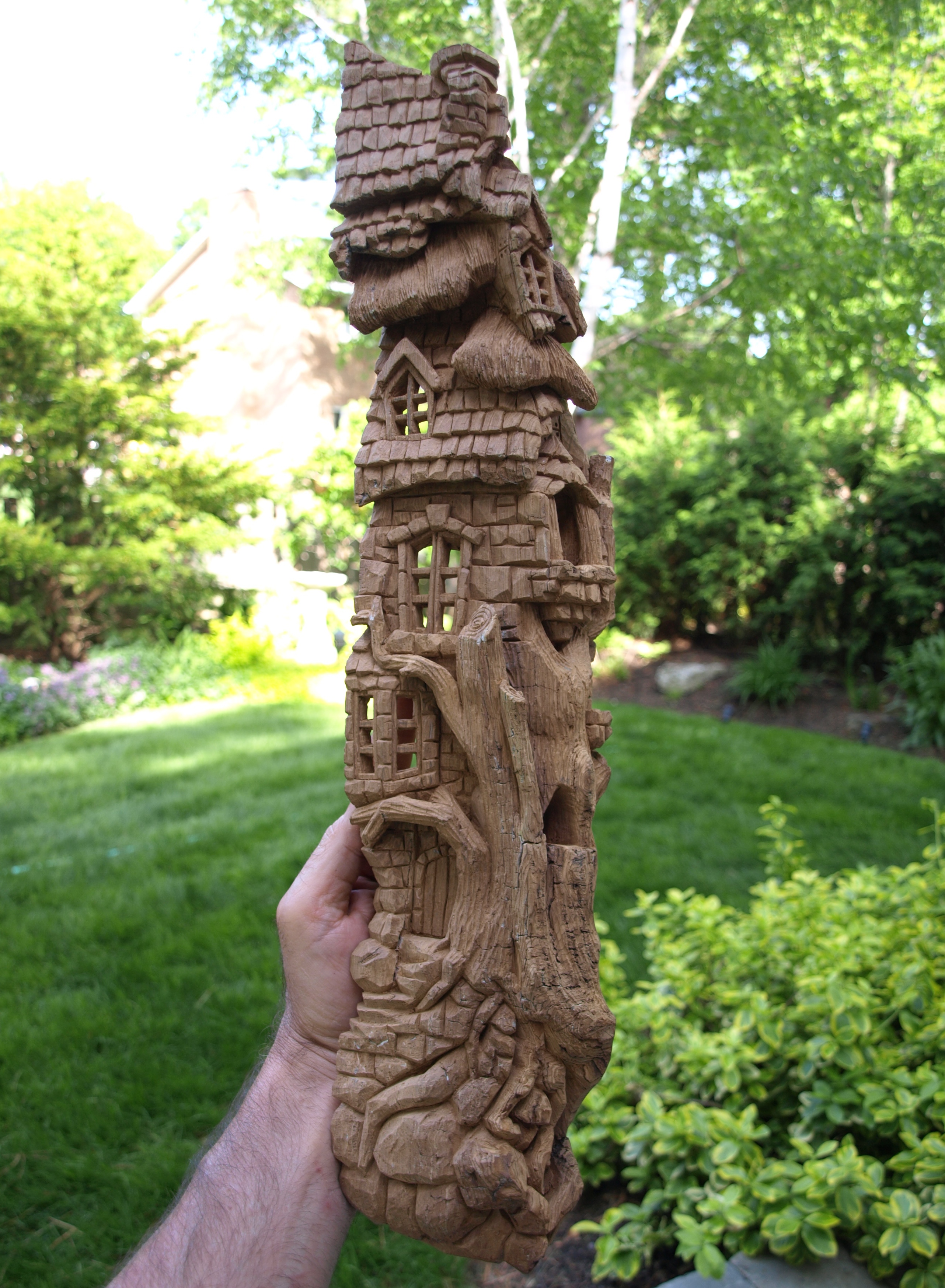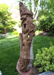 Anywhere that was carved and where the bark was removed, I applied a single coat of clear satin polyurethane with a small brush. This coating automatically adds a nice softly darkened colour to the wood. I prefer to keep the polyurethane away from the uncut, “raw” bark as it darkens it a bit too much for my liking.
