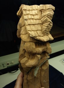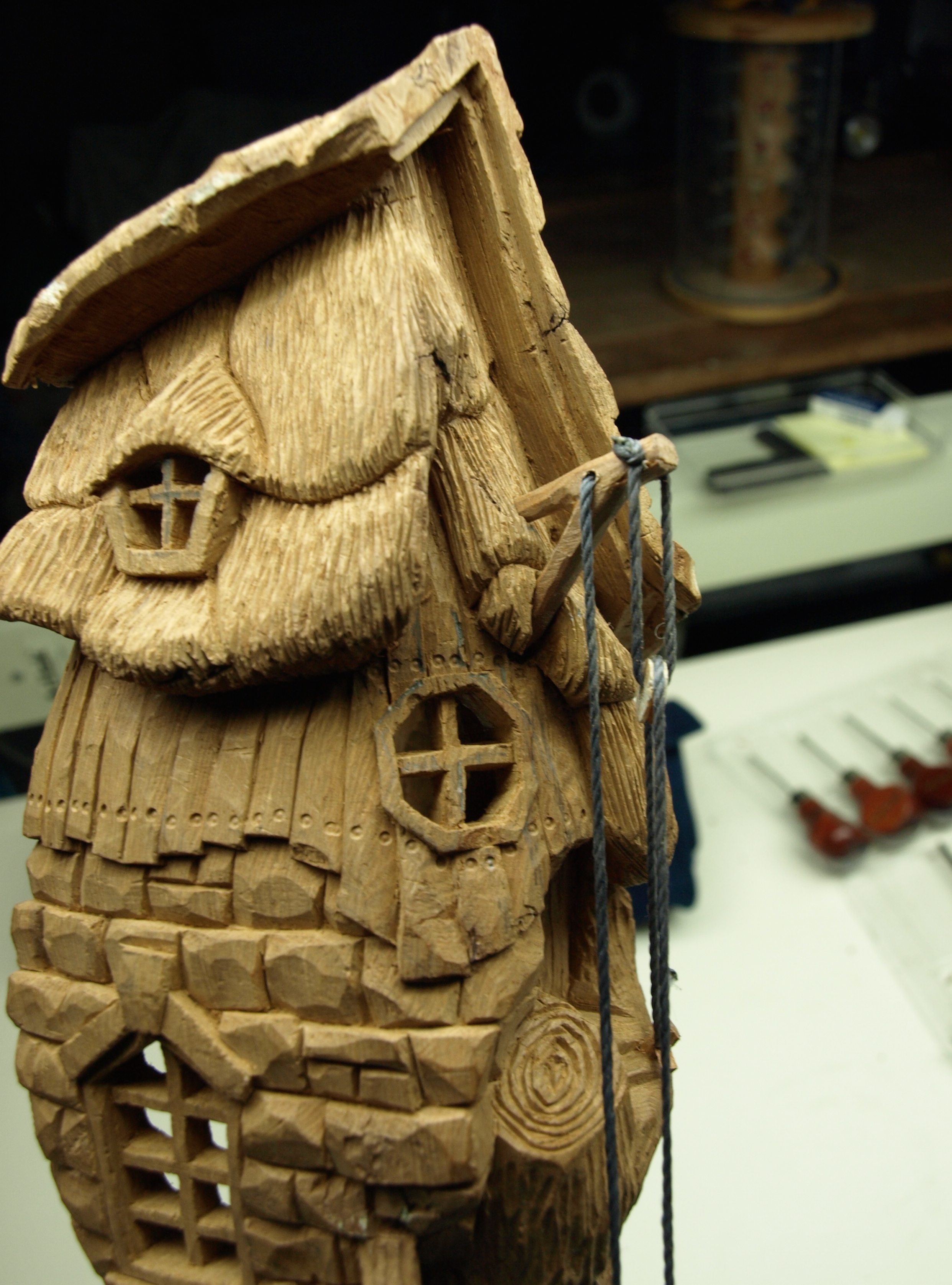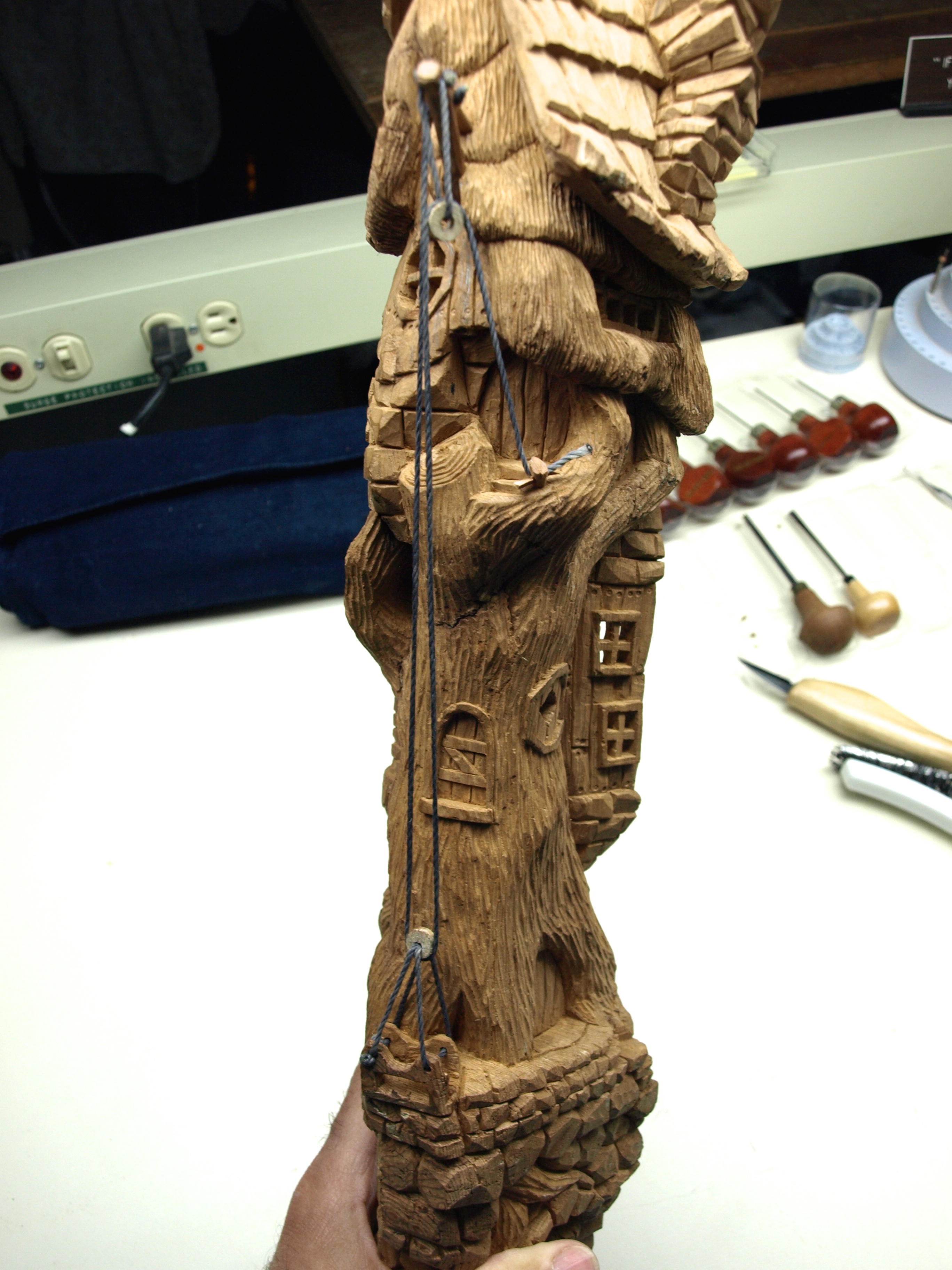 I hollowed out the back of the carving at the window locations so that you could see through the windows. Once the carving is hanging on the wall, the hollowing just leaves a nice impression rather than being really light and open. For the first time, I epoxied an old lamp bulb inside the lens house. Nope…it doesn’t light!