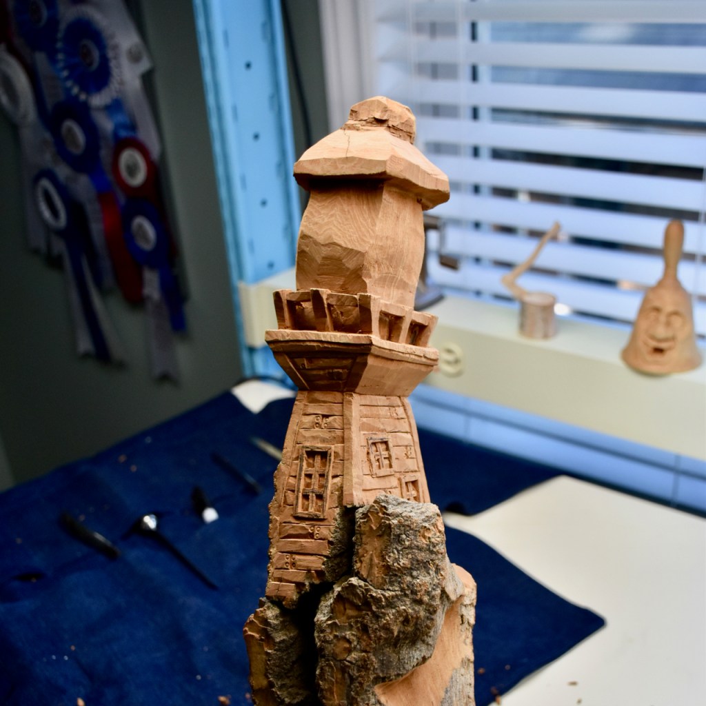 The Typhoon bit is a very aggressive bit made up of multiple carbide “pins” that remove material in a hurry. If you ever try one out, be sure to protect your body, eyes, hands and arms with protective gear. I started with the hexagonal outline of the lighthouse and then followed up with a very shallow profile gouge to smooth things out. The horizontal planks were made with a combination of knives, gouges and a nail punch to imprint some “nail holes” where needed in the resulting siding. I left some wood to make a bit of a railing and then marked out and hollowed out the lighthouse lens and added some shingles to the lens house.